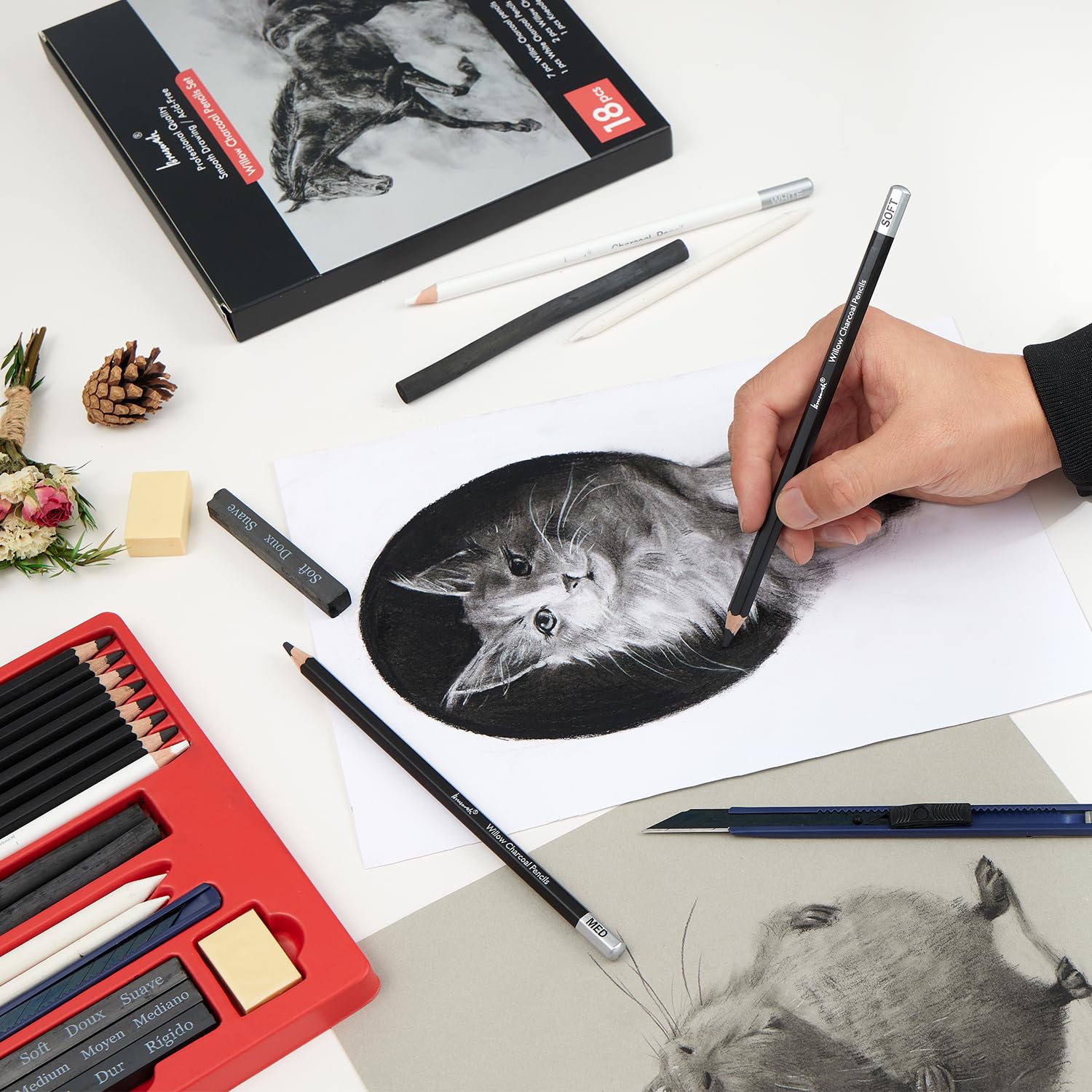 - WILLOW CHARCOAL PENCILS DRAWING SET - 18 Pcs Charcoal Pencil Set Include 7 Willow Charcoal Pencil Pencils(Soft Medium Hard), 1 White Charcoal Pencils, 2 Willow Charcoal Sticks, 3 Charcoal Sticks, 2 Blending Stumps, 1 Art knife, 1 Kneaded Eraser and 1 Vinyl Eraser