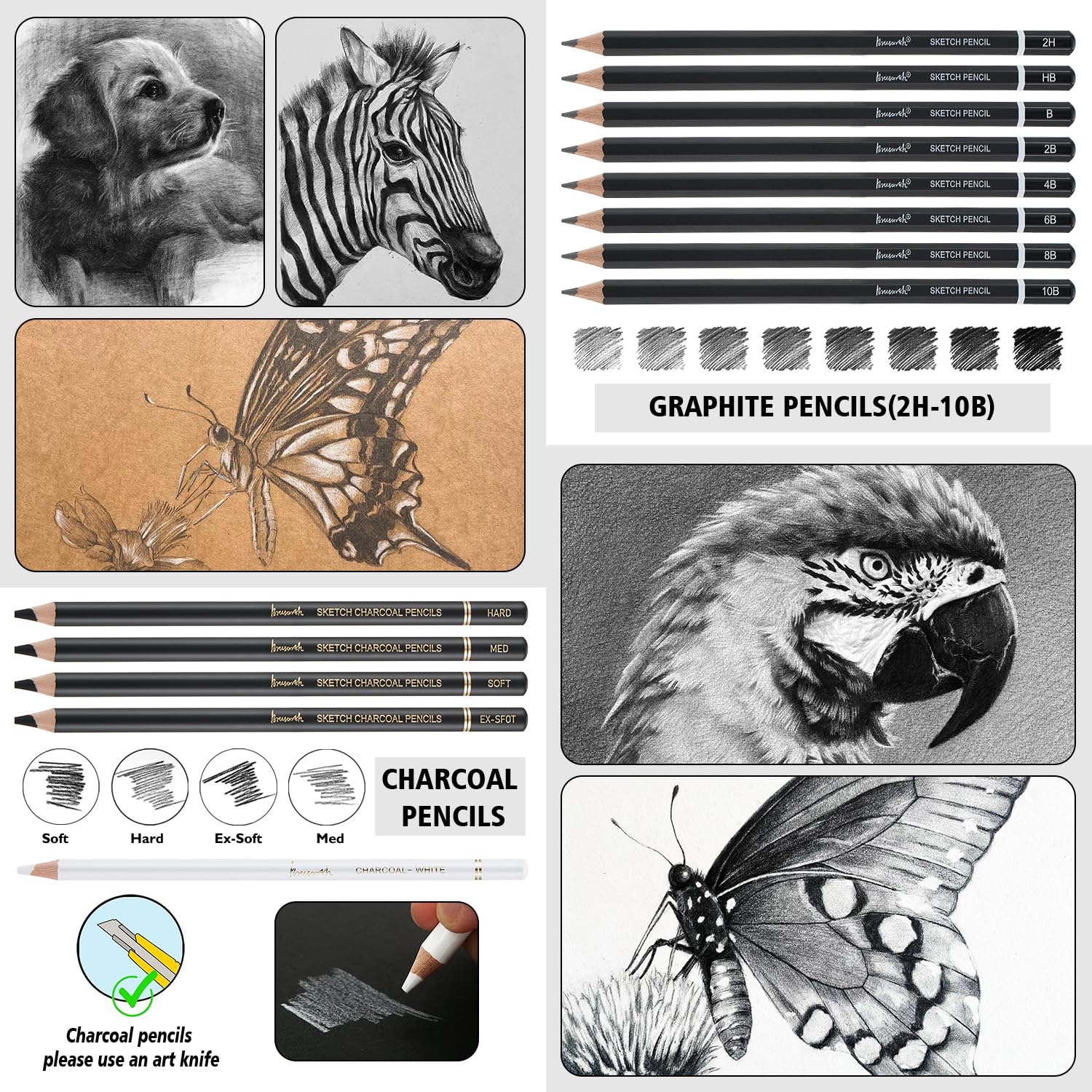 - HIGH QUALITY DRAWING PENCIL SET:Brusarth artist pencils sketching and shading meet beginners' and professionals' needs;The shading pencils for drawing provide smooth gradients;The sketching pencils set includes various hardness levels;The sketch pencils are perfect for detail work and broad strokes;The charcoal sketch set has all necessary tools for drawing projects