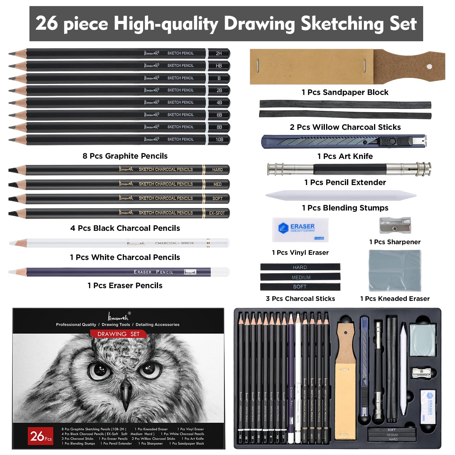 - SKETCH PENCILS DRAWING SET - 26 Pack Art Pencil Set Include 8 Graphite Sketching Pencils(10B-2H), 4 Black Charcoal Pencils(EX-Soft Soft Medium Hard), 1 White Charcoal Pencils, 3 Charcoal Sticks, 1 Eraser Pencils, 2 Willow Charcoal Sticks, 1 Blending Stumps, 1 Art Knife, 1 Pencil Extender, 1 Sharpener,1 Sandpaper Block,1 Kneaded Eraser and 1 Vinyl Eraser, This professional sketch Pencils drawing set will give a fuller expression of your work
