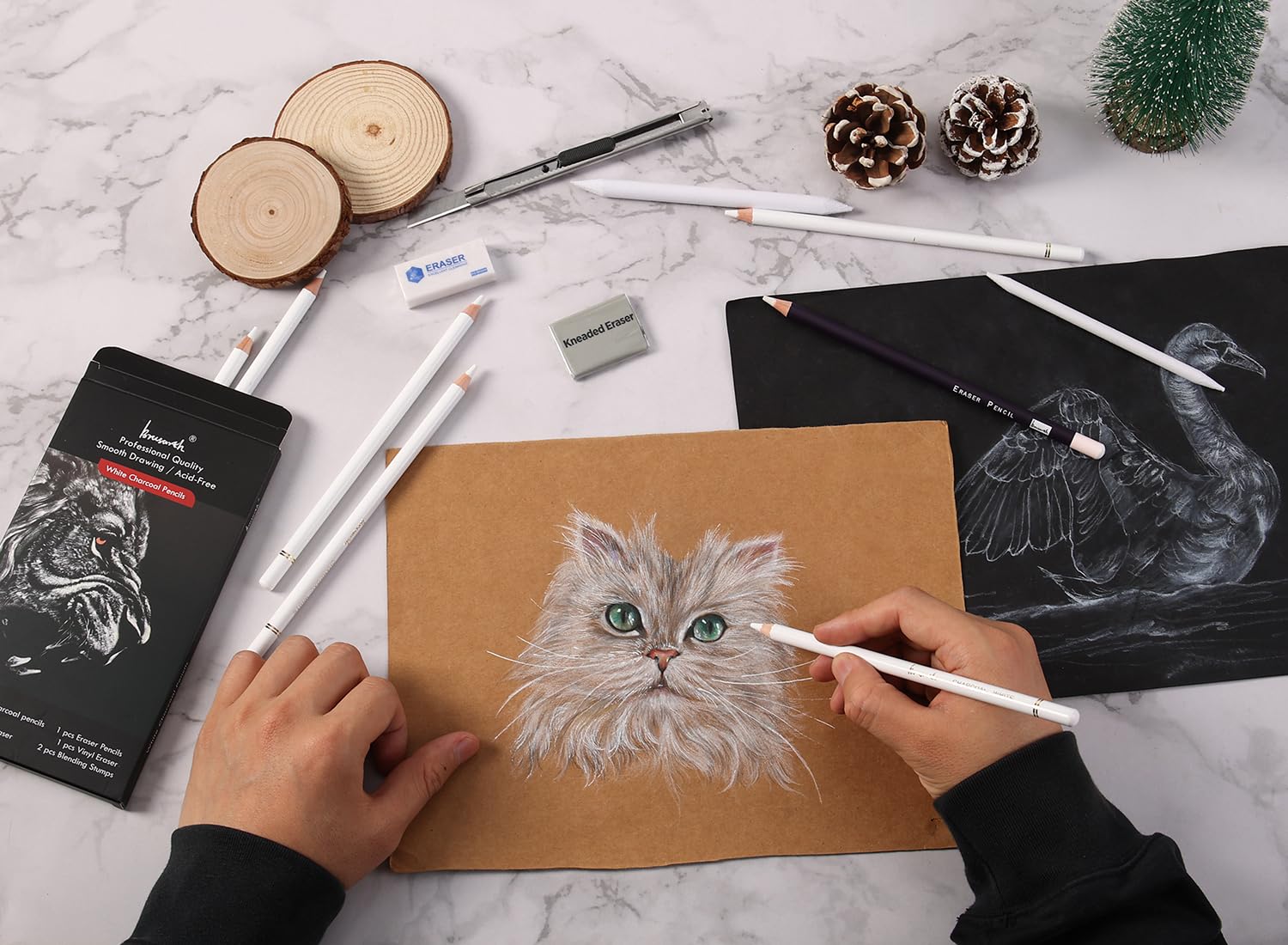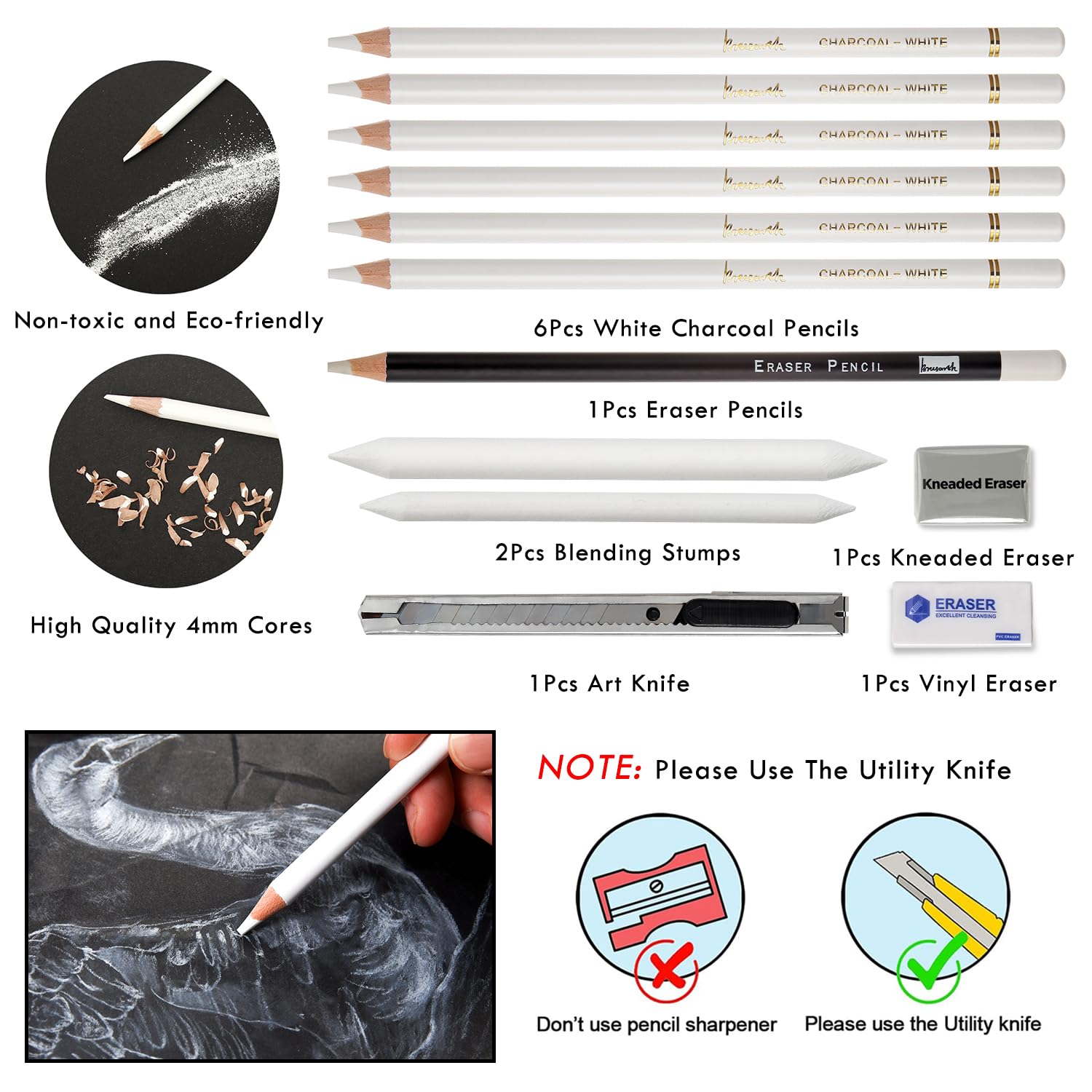 - WHITE CHARCOAL DRAWING SET: White Charcoal pencils for artists come with 6 pcs White charcoal pencils, 1 Eraser Pencils , 1 Art knife, 1 Vinyl Eraser, 1 Kneaded Eraser, 2 pcs Blending Stumps