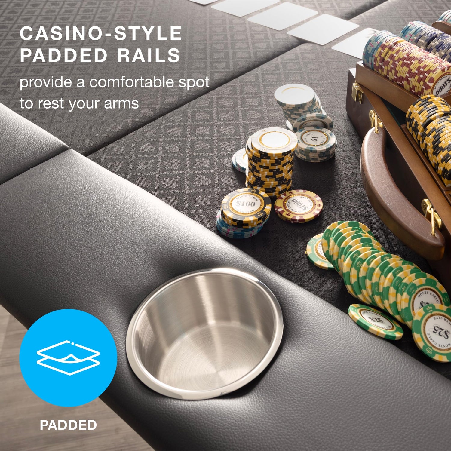 - Premium Casino-Grade Speed Cloth: The black casino-grade felt tabletop adds a luxurious feel and makes dealing easier. The casino-style padded rail provides a comfortable spot to rest your arms no matter how long the game goes