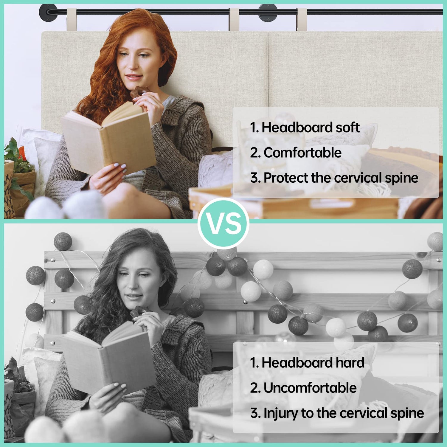 - 【Stable Frame & Soft Edge】Queen size headboard can supported by durable solid wood plywood frame, our headboard features outstanding toughness and bending resistance for long-lasting use. All sides are wrapped with soft edges for higher security. Additionally,The metal rails hang headboard further enhance stability.