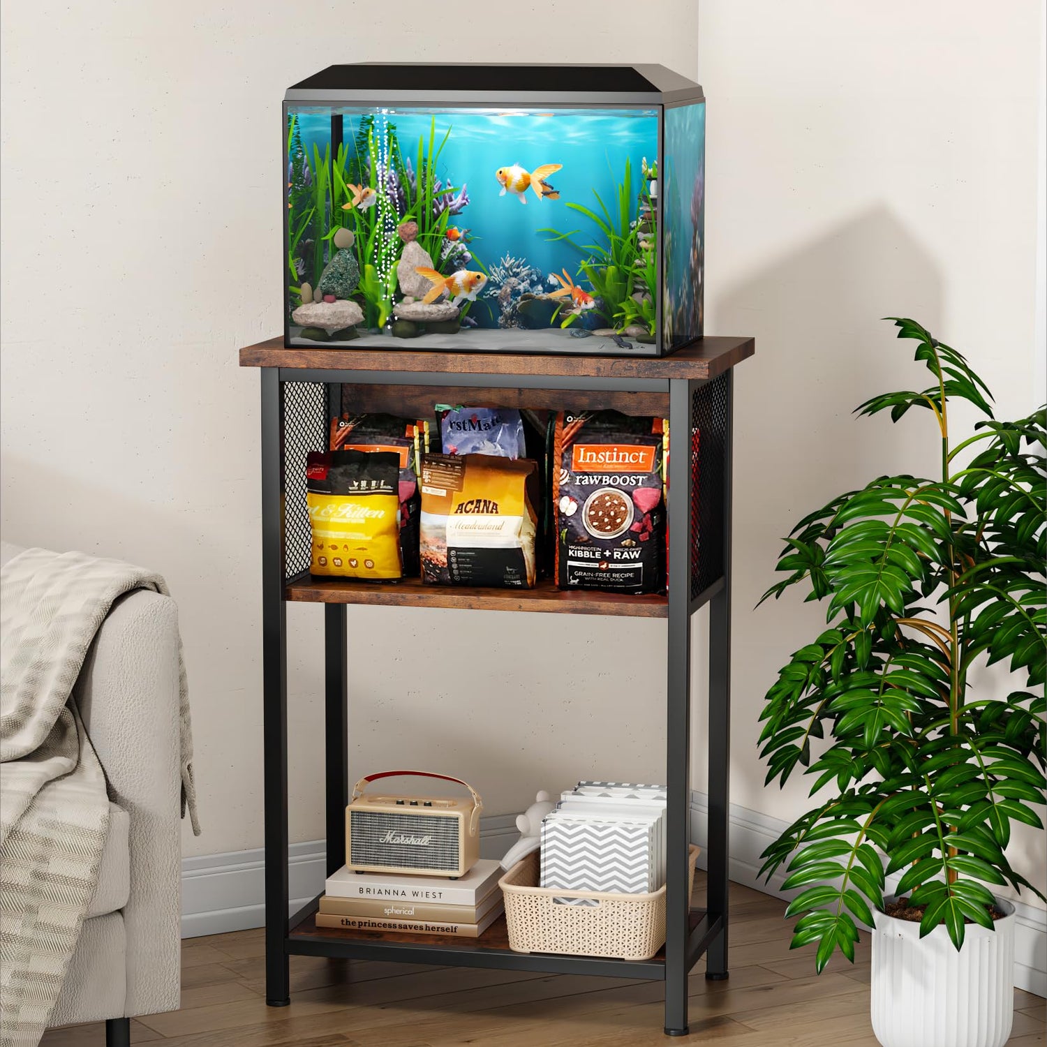 - Fish Tank with Stand: This aquarium stand features a storage cabinet in the middle, which is convenient for storing aquarium supplies such as fish food, fishing nets etc., This ensures a tidy and organized environment around your aquarium