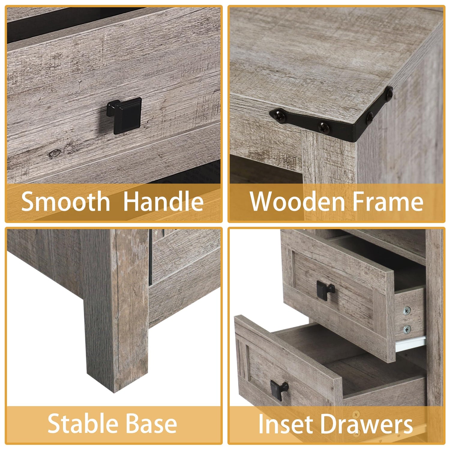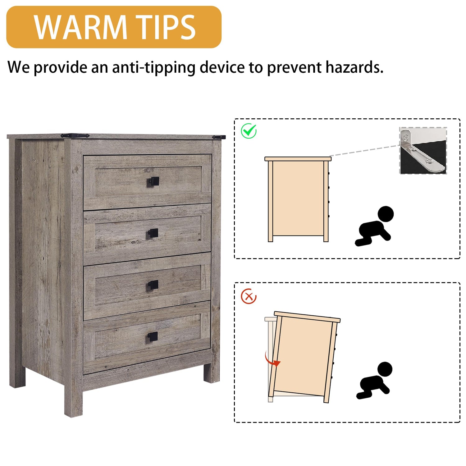 - 【Large Storage Space】Size: 24"W x 16.5"D x 35"H, single drawer: 19"W x 11.8"D x 5"H. Our bedroom dresser furniture comes with four drawers, each capable of holding 15-20 t-shirts or 10-15 pairs of jeans. The top of the rustic gray dresser can also hold potted plants, table lamp, antique clock etc.