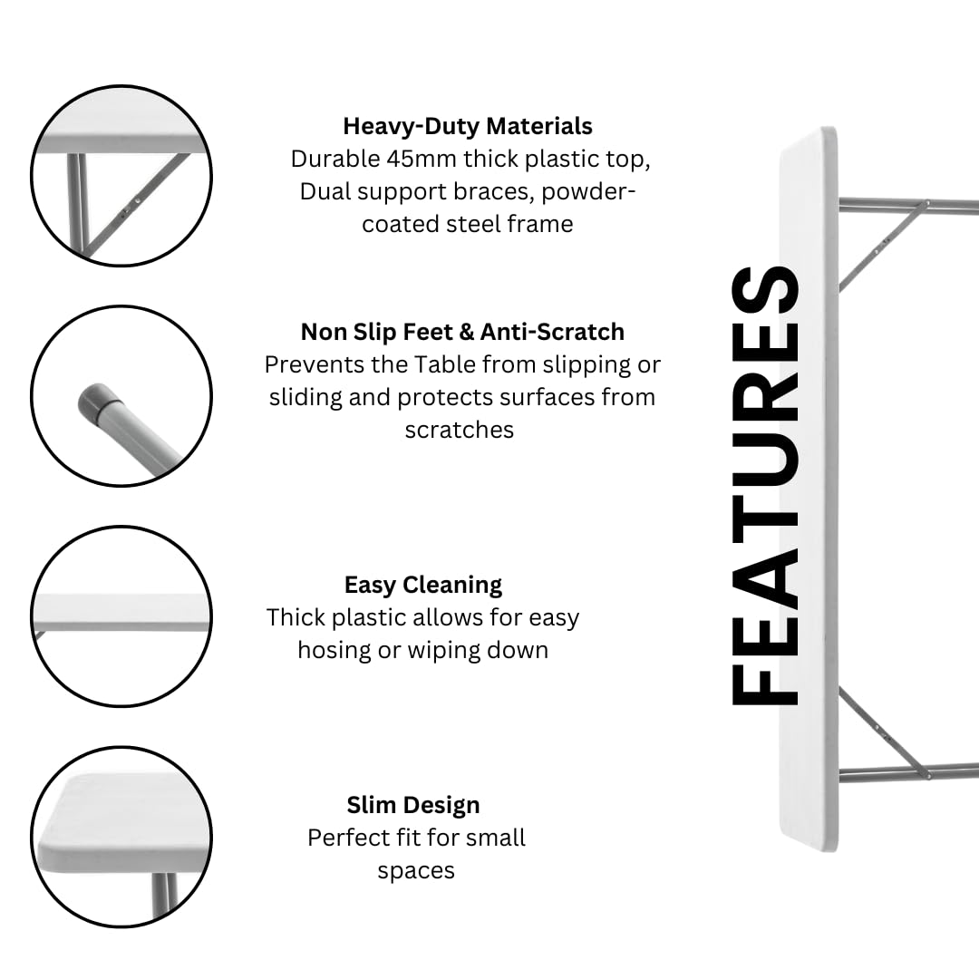 - SUPER STURDY & DURABLE: Tabletop made from durable 45mm thick plastic, easy to clean and maintain. It features a granite white smooth textured finish that is both modern and professional, suitable for a variety of settings. The table is easy to set up and folds down legs neatly under the table for easy storage and transport, ideal for limited space. Push up angled braces towards the table top corner to fold. Recommended to store indoor and protect from long periods of moisture & wet weather