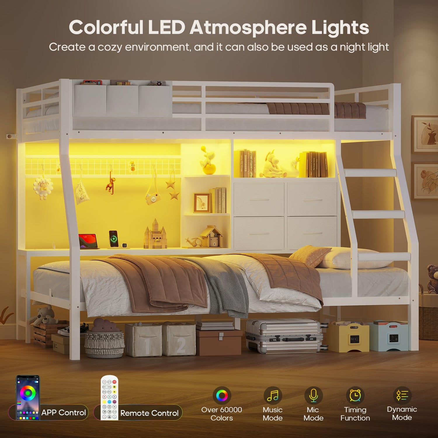 - 【Colorful LED Atmosphere Lights】The bunk bed twin over twin is equipped with RGB LED lights that can be controlled via a mobile app and remote control. There are over 60,000 colors to choose from, and you can also customize the brightness, dynamic mode, music sync mode, microphone mode, and timing function according to your preferences. It can be used as a night light or for entertainment, and is very popular with children