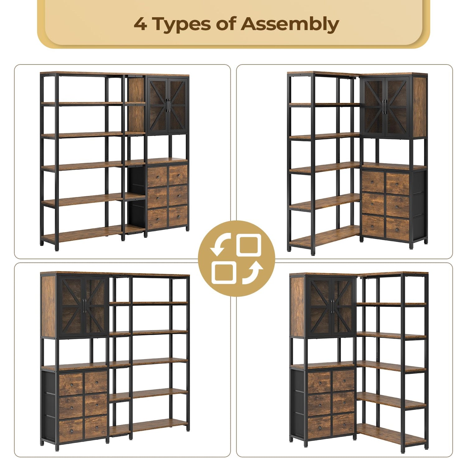BTHFST Corner Bookshelf 6 Tier, 70.9" Convertible Tall Bookshelf with 6 Fabric Drawers, Corner Bookcase with Metal Doors, Large Display Shelf Book Shelf for Living Room,Home Office, Rustic Brown