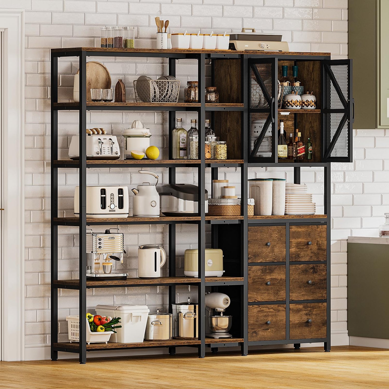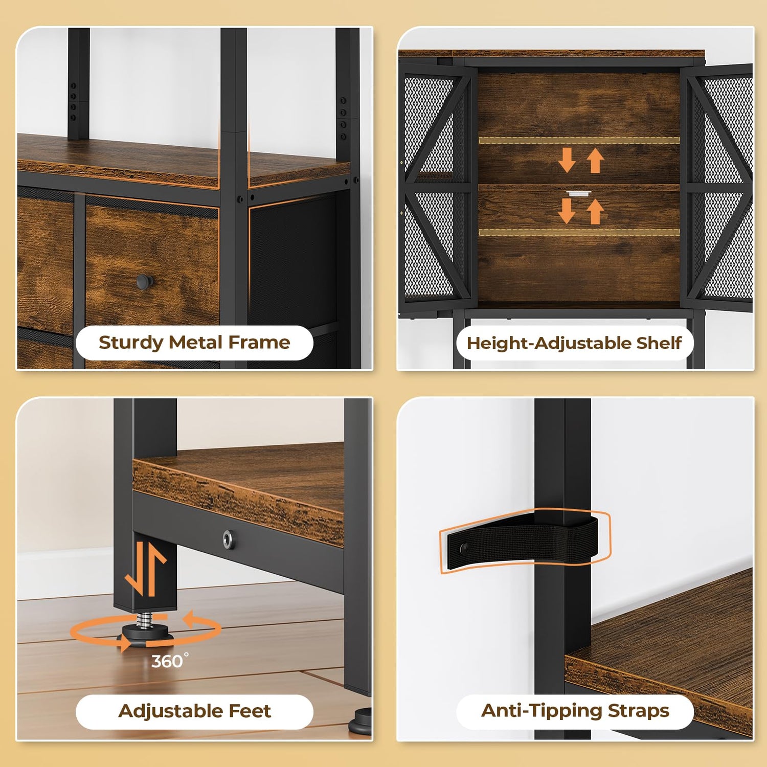 - 【Open and Closed Storage Spaces】The corner shelf offers 6 tiers of open shelves, allowing you to easily display books, ornaments, and household knickknacks. There are also unique cabinets with metal mesh doors that provide secure storage space while adding a touch of industrial chic to your home. What's most endearing is the 6 fabric drawers that are equipped to easily organize those messy little items. They can hide the triviality of life, so that the home environment is always kept tidy
