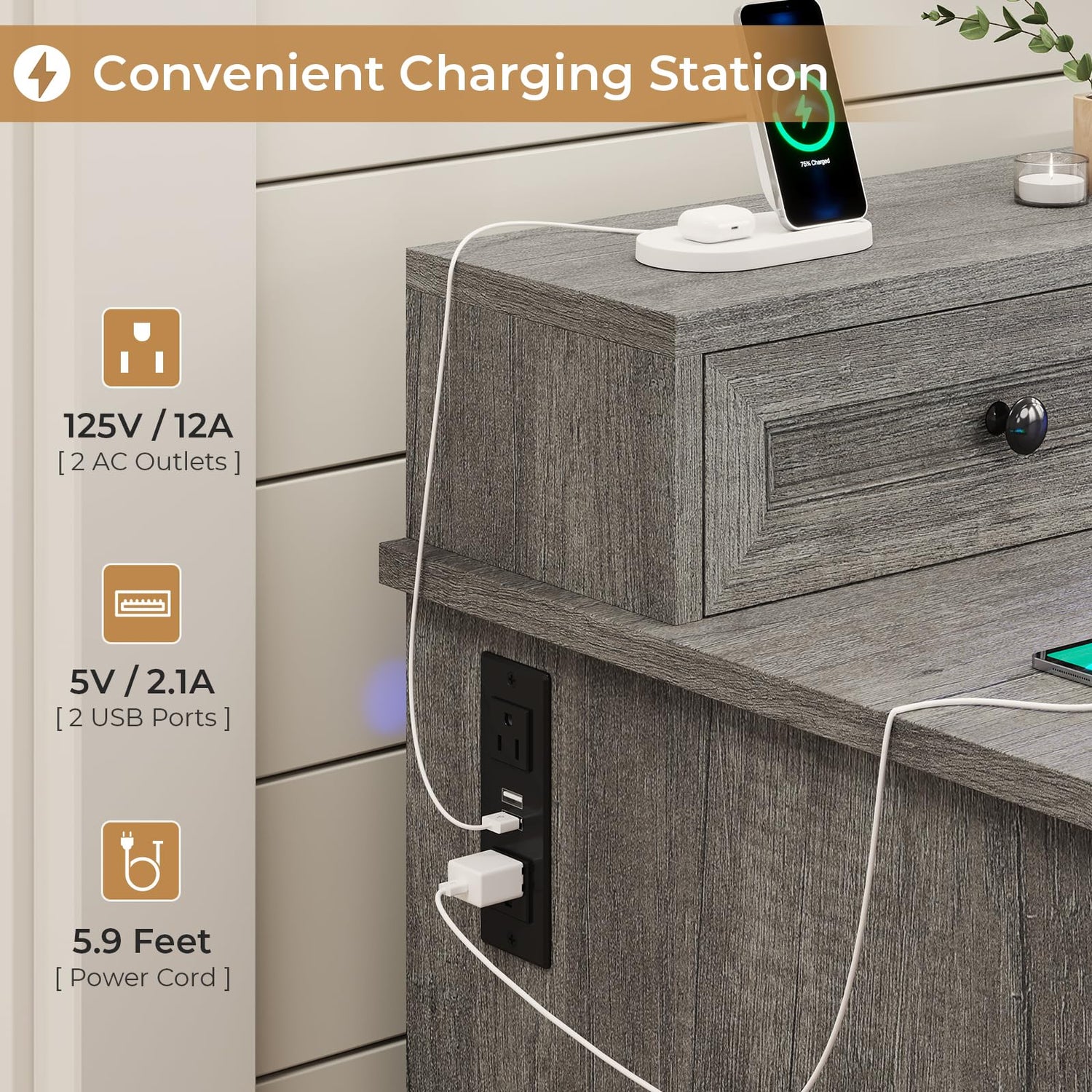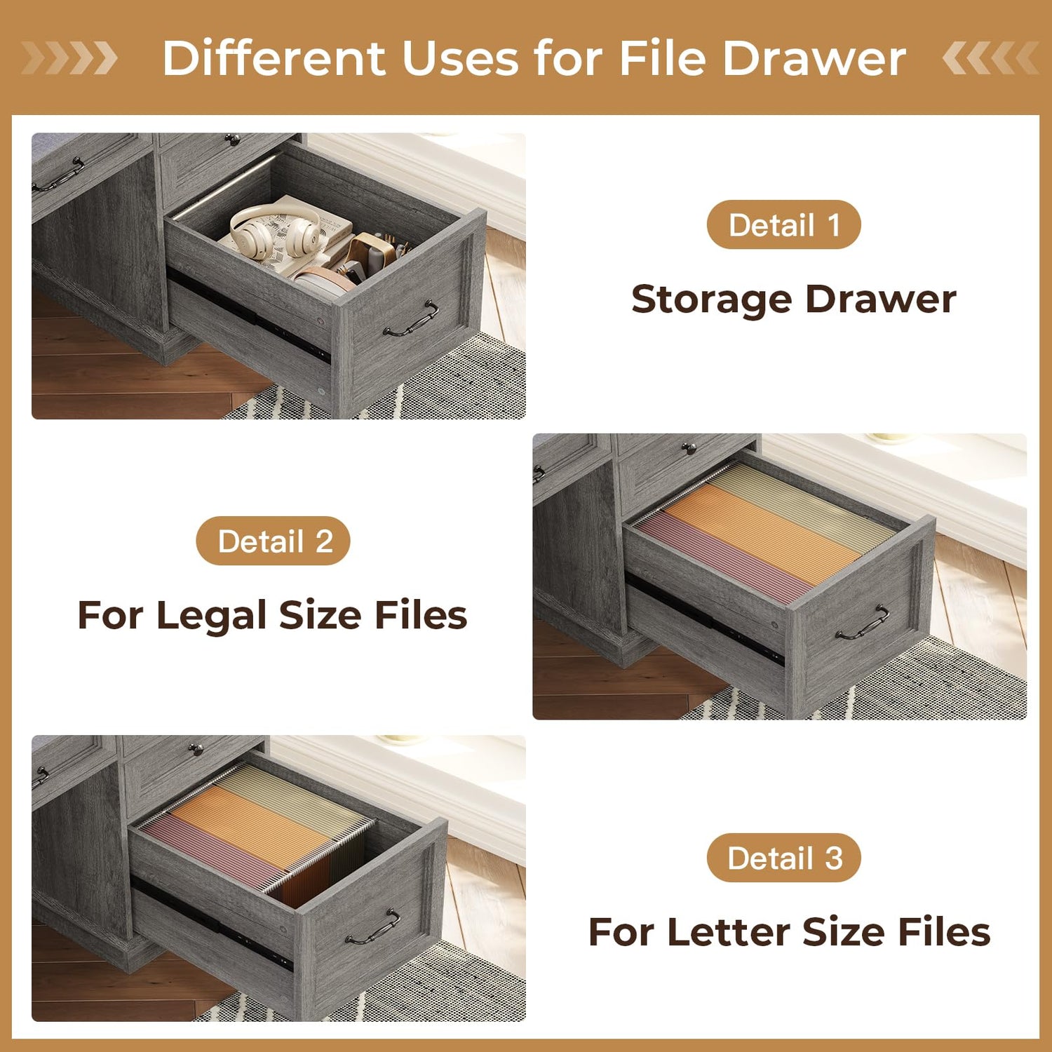 BTHFST Farmhouse Executive Desk with File Drawer, Computer Desk with Charging Station & LED Lights, Home Office Desk with Drawers & Storage Cabinet, Executive Office Desk with Monitor Stand, Grey