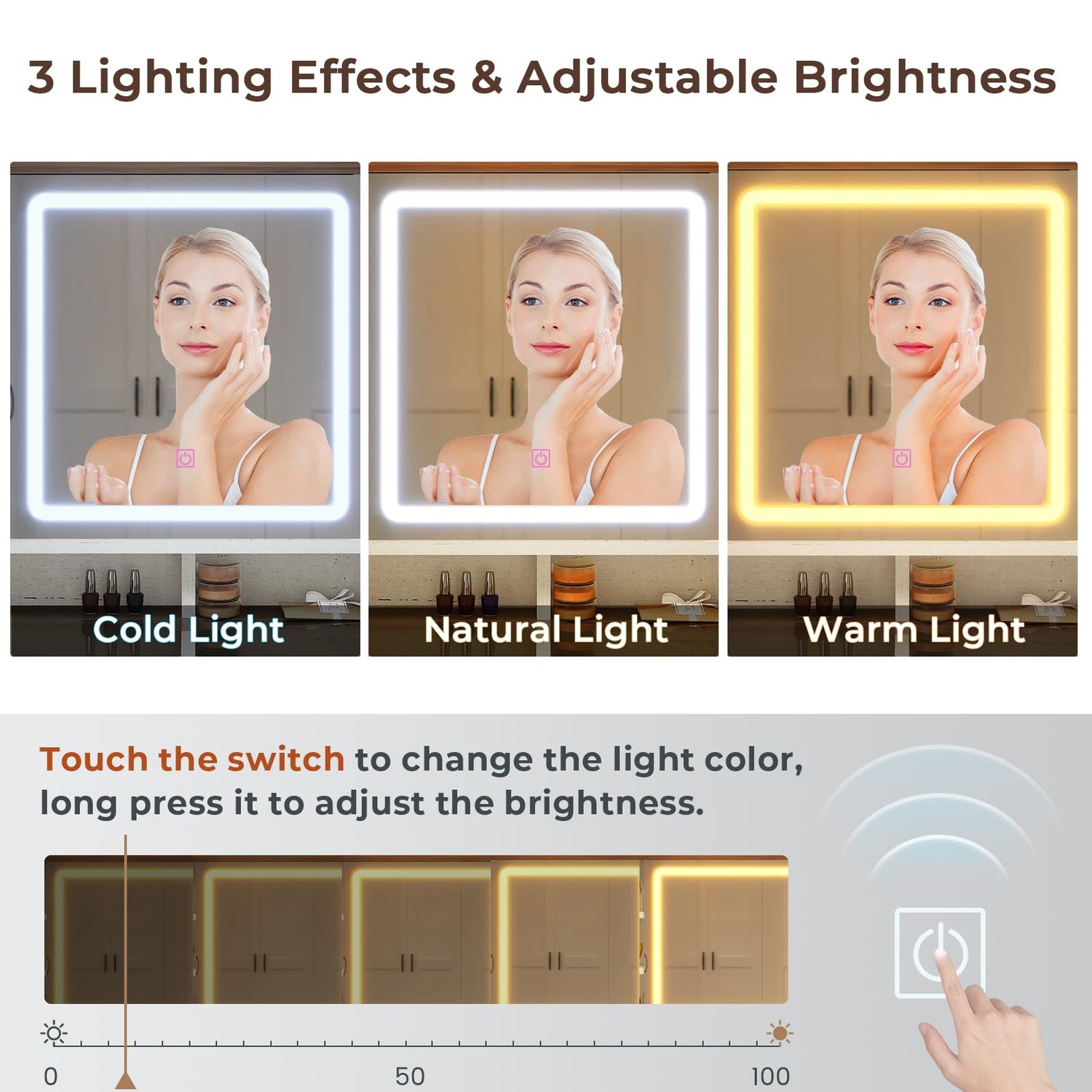 - 【Smart LED Light Storage Mirror】The mirror of the makeup table has a built-in LED light strip, which is safer and more beautiful. You can control the light by touching the switch on the mirror. Touch to switch the light color: cold light, natural light, warm light. Press and hold to adjust the light brightness. Opening the mirror reveals 3 layers of hidden storage shelves.
