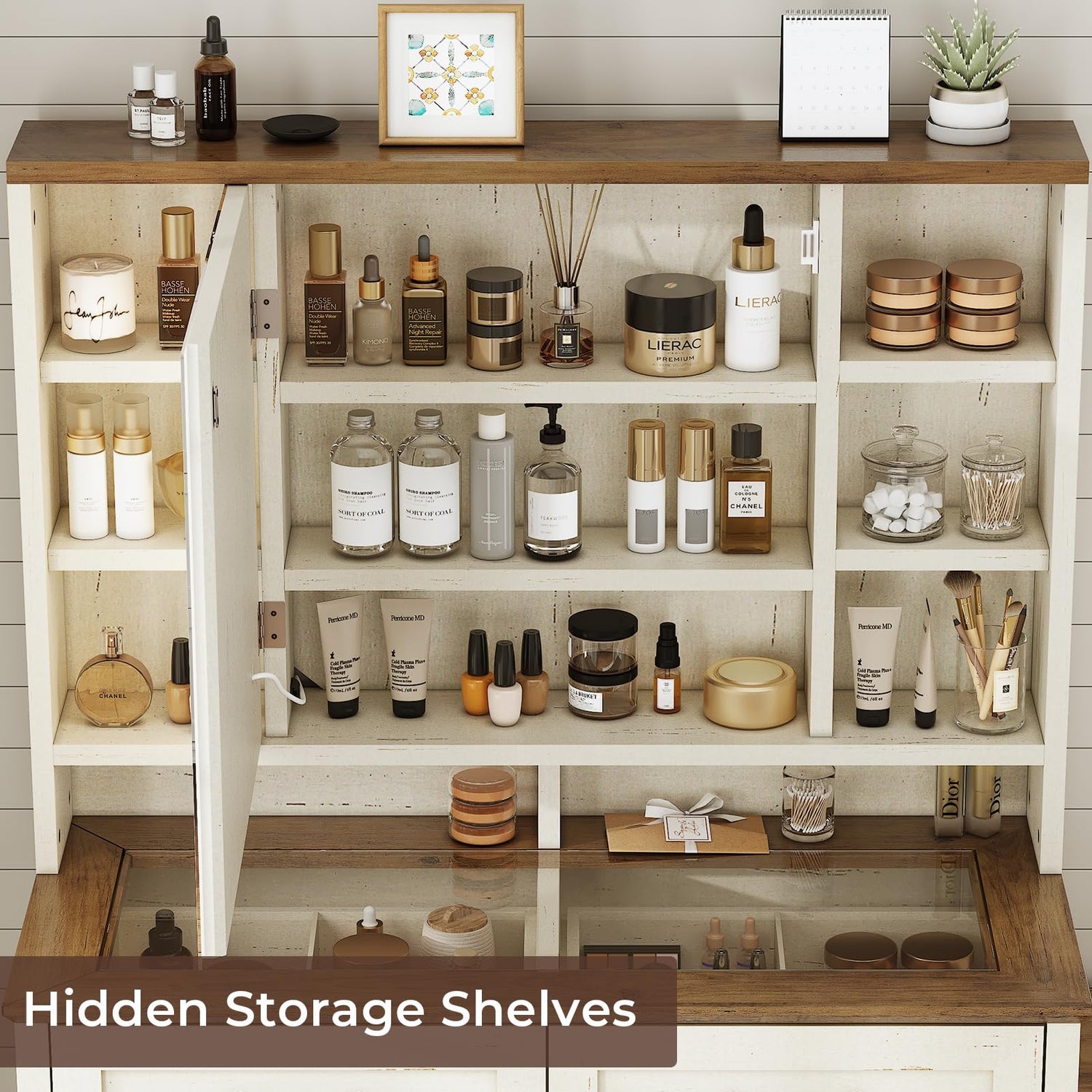 BTHFST Farmhouse Vanity with Glass Top & Charging Station, Vanity Desk with Touch Screen Mirror and Lights, Makeup Vanity with 5 Drawers & Shelves & Cabinet, Antique White