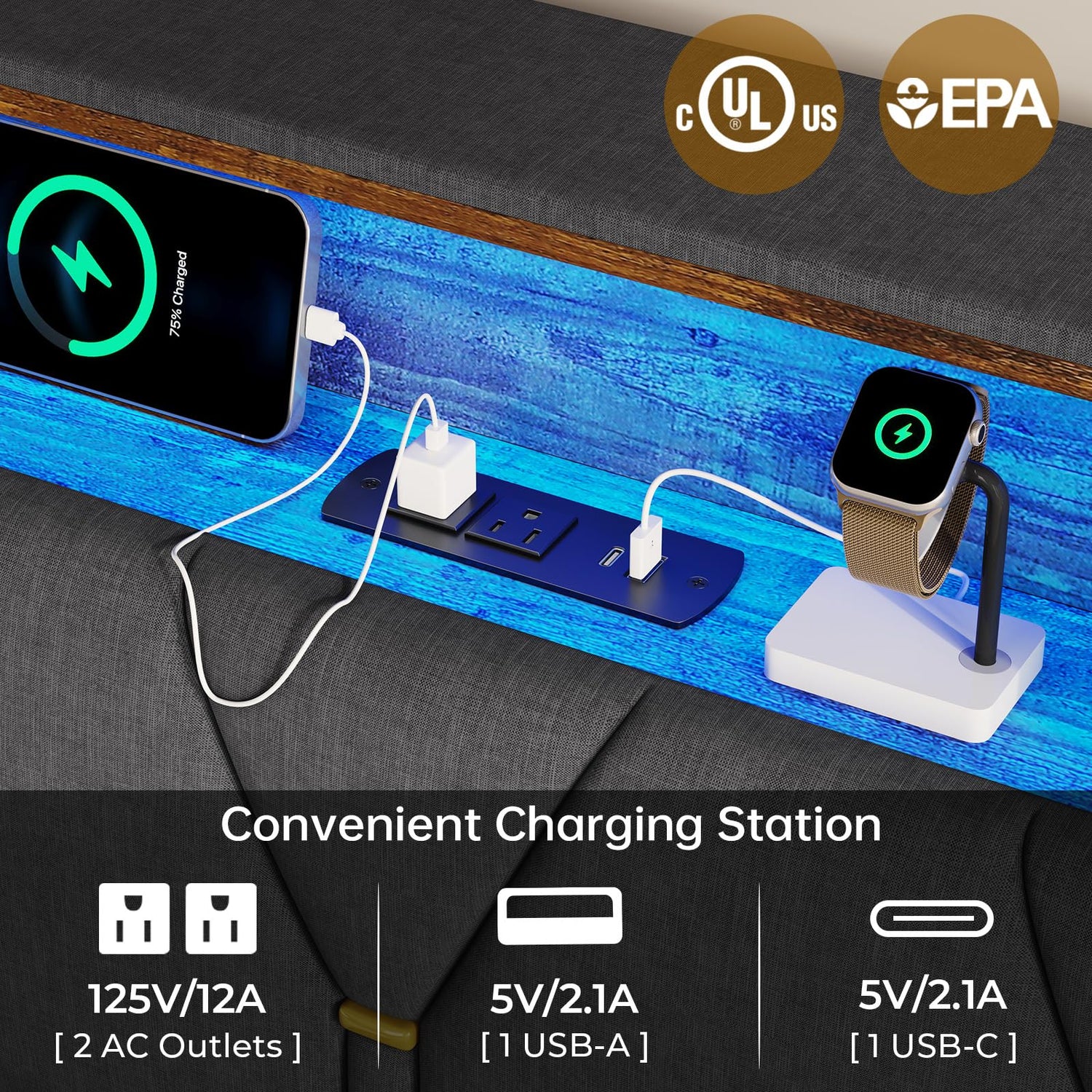 - 【Bed Frame with Charging Station】The built-in power strip on the headboard has 2 outlets and 2 USB ports, which is very convenient for you to charge your phone, tablet, headphones and other electronic devices. So you don't have to look around for charging stations anymore.