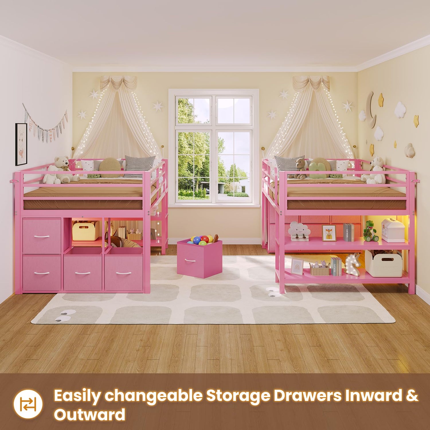 BTHFST Low Loft Bed Twin Size with 6 Storage Drawers, LED Lights, 2 Tier Storage Shelves, Kids Metal Loft Bed with 15" H Stairs & Safety Guardrail, Spave Saving, Pink