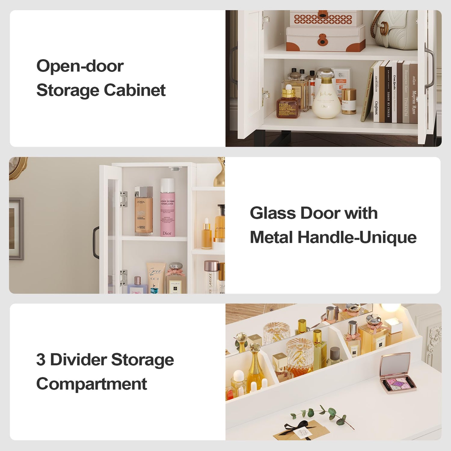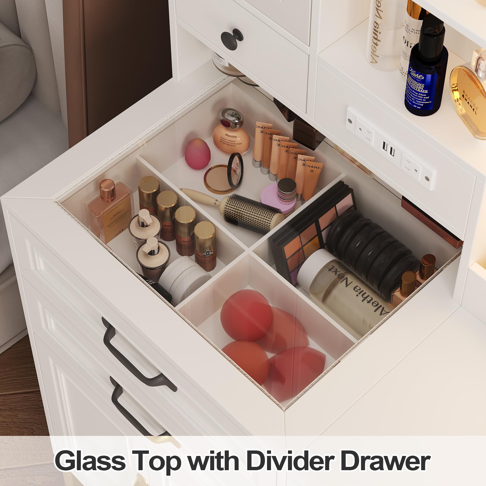 - 【Glass Table Top & Drawer Dividers】The glass tabletop on the left drawers is special and unique design. Providing a display and facilitates a clear view of items stored in the drawer and dividers in the drawer ensure you easily organize and find your need items, in additional adds elegant atmospherefor your bedroom.