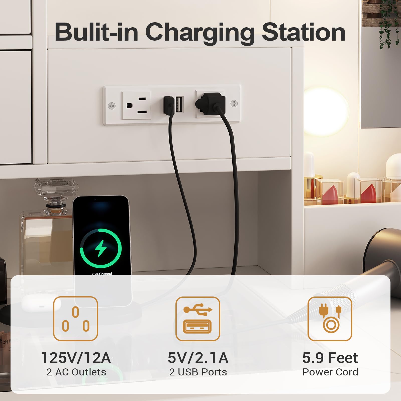 - 【Convenient Charging Station】No more anxiety about charging! The built-in power strip of this makeup table includes 2 USB ports and 2 standard outlets, making it easier to connect a hair dryer, beauty instrument, and charge mobile phones, tablets, or other electronic devices at the same time. Bringing you more convenience.