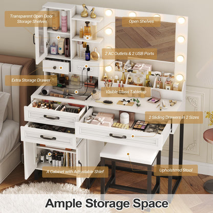BTHFST Makeup Vanity Desk with Mirror and Lights & Charging Station & Makeup Stool, Vanity Table Set with Glass Top Storage Drawer & Beach & 3 Shelves for Bedroom (Modern White & Black)
