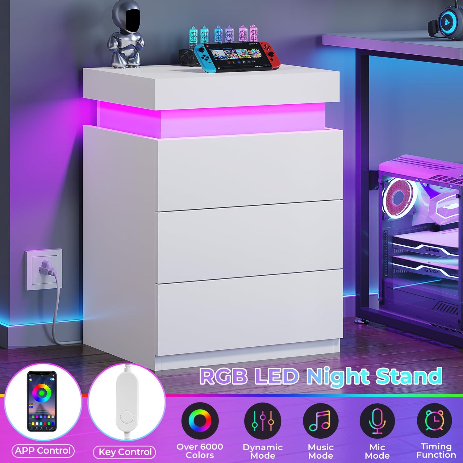- 【Nightstand with RGB led lights】The bedside table is equipped with RGB light strips, which can be controlled by button or mobile app. There are more than 60,000 colors of LED lights to choose from, and there are also modes such as style mode, music mode, microphone mode, and timer function waiting for you to explore. You can design a unique light show according to your own preferences.