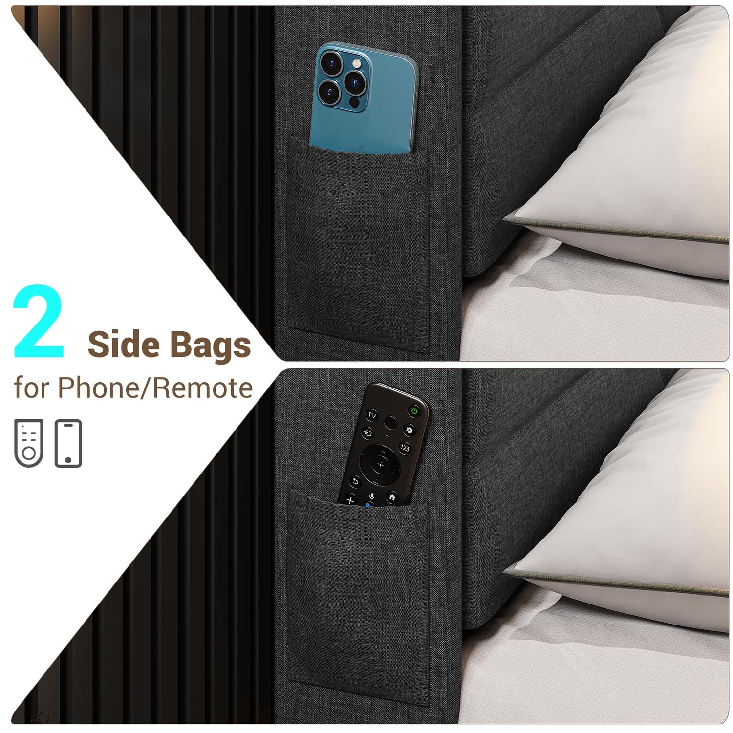 The headboard isn't just about functionality; it also offers secret storage space to keep your personal items tucked away. With an open shelf that provides easy access to your nighttime necessities, you'll have everything you need right at your fingertips. Additionally, the two side bags for your remote control and phone ensure your devices are always within reach, adding to the practicality of your sleep environment.