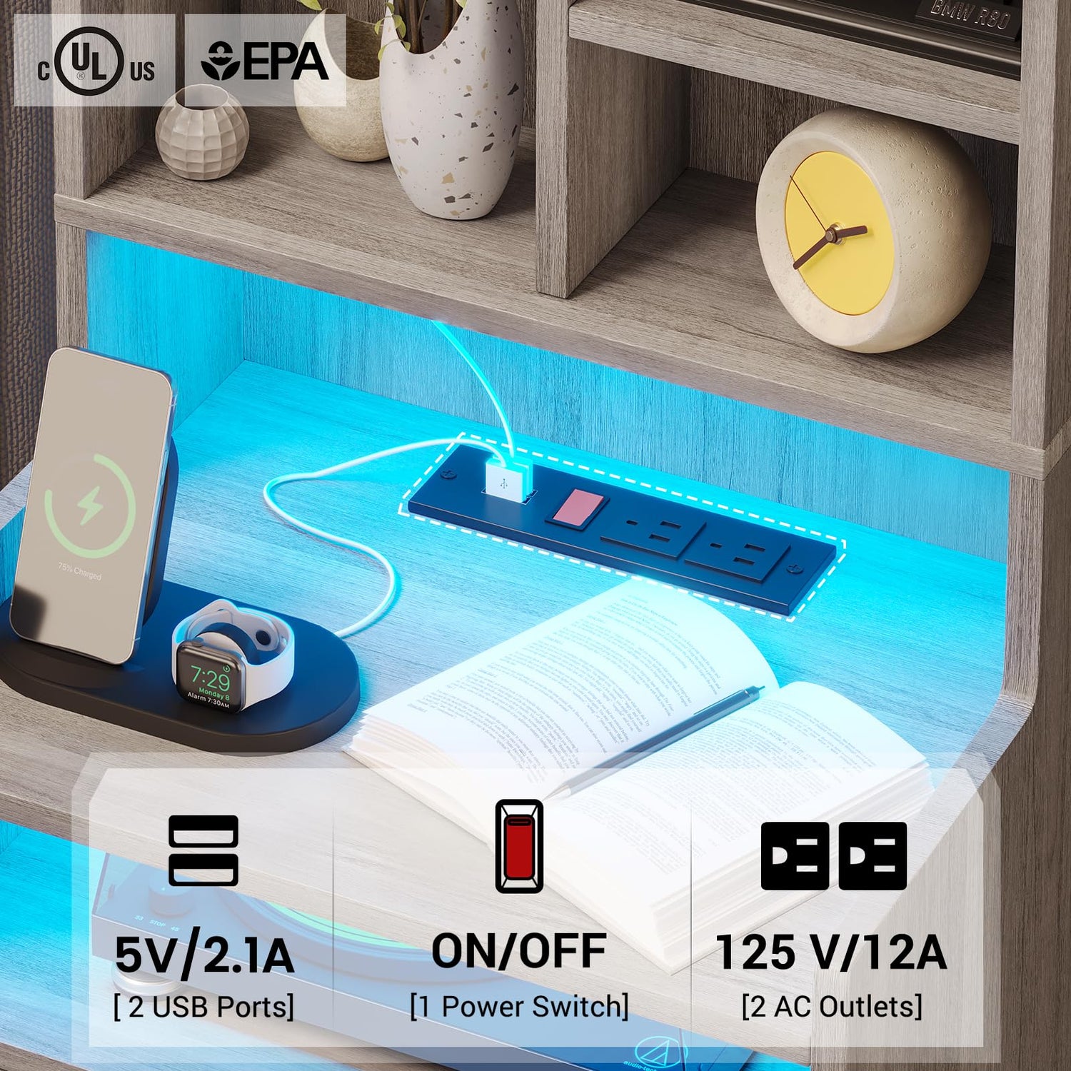 BTHFST Grey Tall Nightstand Set of 2 with LED Lights and Charging Station