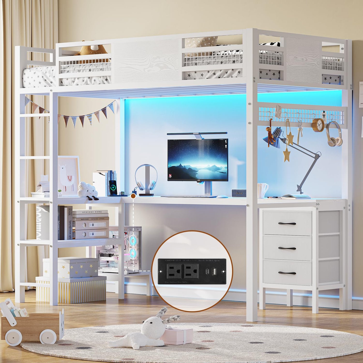 BTHFST Twin Loft Bed with L-Shaped Desk, LED Lights, Charging Station & Storage Solutions