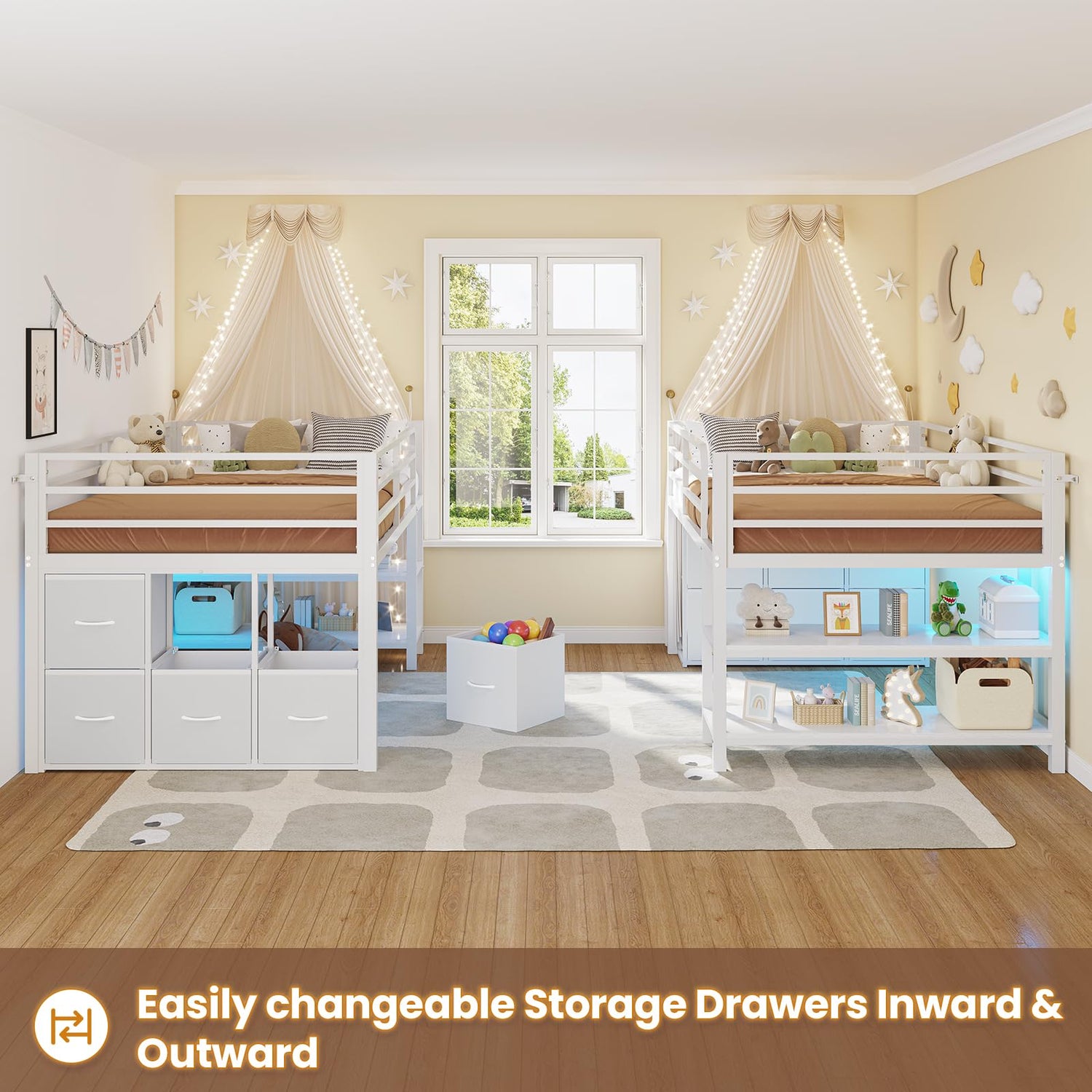 BTHFST Twin Size Low Loft Bed with 6 Fabric Storage Drawers, Metal Loft Bed Twin with LED Lights & Open Storage Shelves, 15" H Safety & Guardrail Stairs Loft Bed for Kids, White