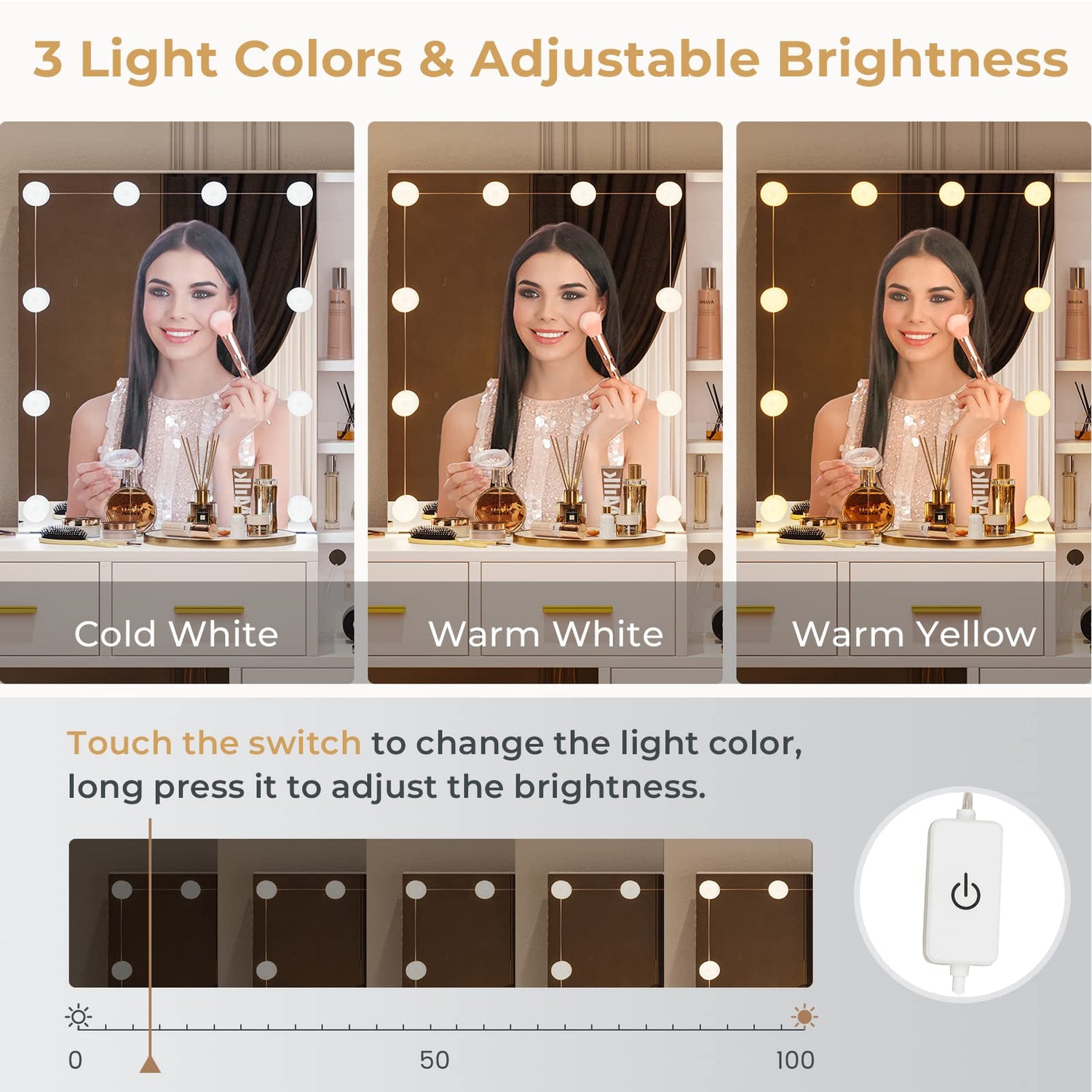 - 【3 Lighting Modes & Adjustable Brightness】This makeup table is equipped with 10 LED bulbs, which have 3 light modes of warm yellow, warm white and cool white, and the brightness of each color can be adjusted. Whether it is day or night, it can give you a makeup experience like a star.