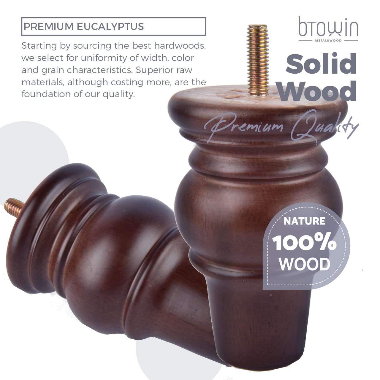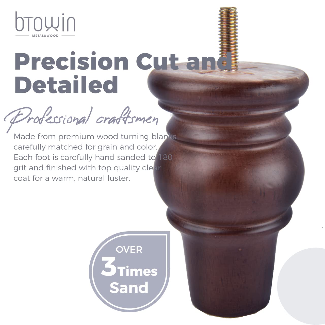 Btowin 4 inch Solid Wood Furniture Legs, 4Pcs Wooden Turned Bun Feet with Threaded 5/16'' Hanger Bolts & Mounting Plate & Screws for Sofa Couch Chair Ottoman Loveseat