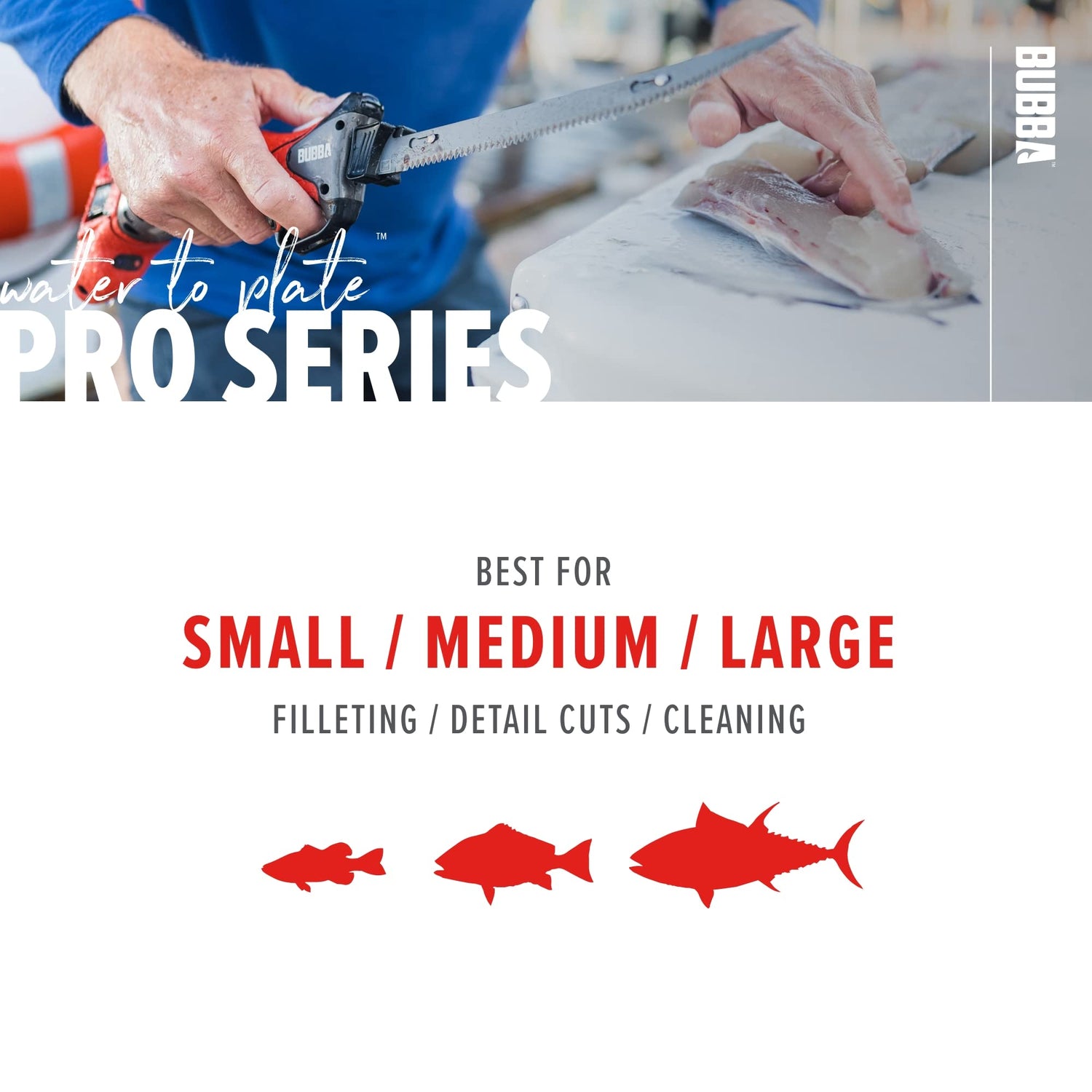 Details: The best just got better! The all new, PRO Series Electric Fillet Knife has been completely upgraded to a more robust design for longer life, more power, and more run time than any brushed electric fillet knife on the market. The Pro Series Electric Fillet Knife has been redesigned from the ground with top of line commercial features such as a heavy-duty drive system, aluminum alloy housing, superior ergonomics, and a brushless motor for optimal long-lasting power output. This PRO Series Electric Fillet Knife is designed for the hardcore angler who needs heavy duty equipment to tackle the largest of fish while working day in and day out in the toughest of conditions. We have completely updated the carry case to be a hard-sided shell with a textured non-slip grip integrated into the top for ultimate strength and durability in protecting the PRO Series Electric Fillet Knife. We’ve included a secondary replacement battery and charging cord for maximum battery life. Our PRO Series EFK will also come with four of our iconic EFK blades—7” E-FLEX, 9” E-FLEX, 9” E-STIFF and 12”E-STIFF. All of our blades are constructed of high carbon stainless steel and coated with titanium-nitride for extreme corrosion resistance. The Bubba Pro Series EFK is built to meet the needs of any professional or recreational angler.