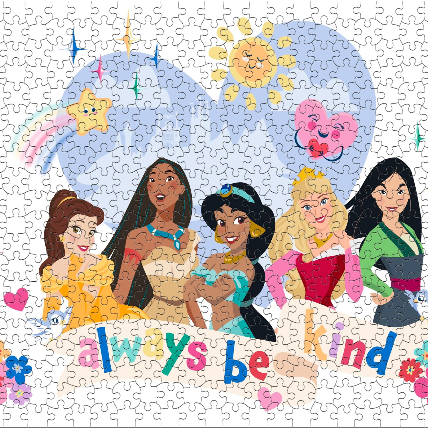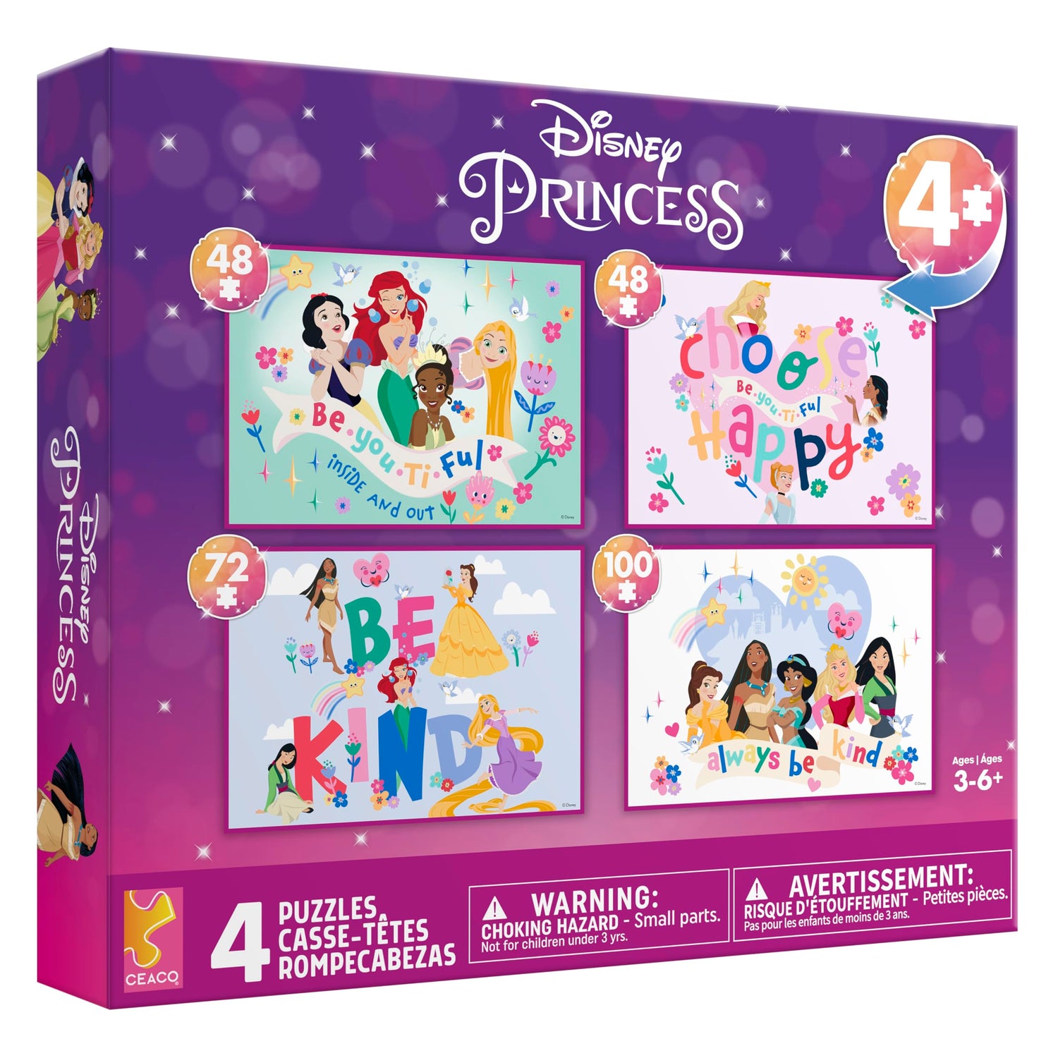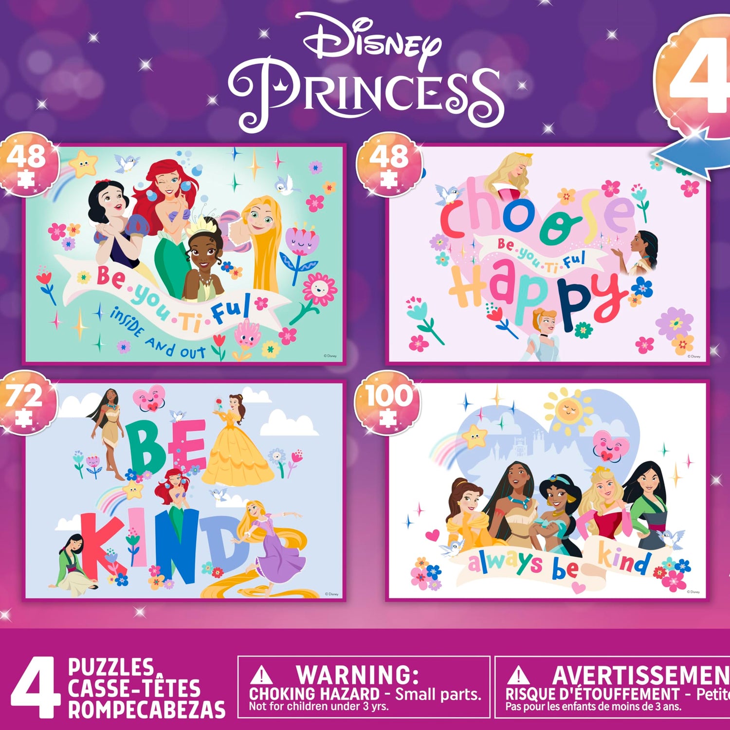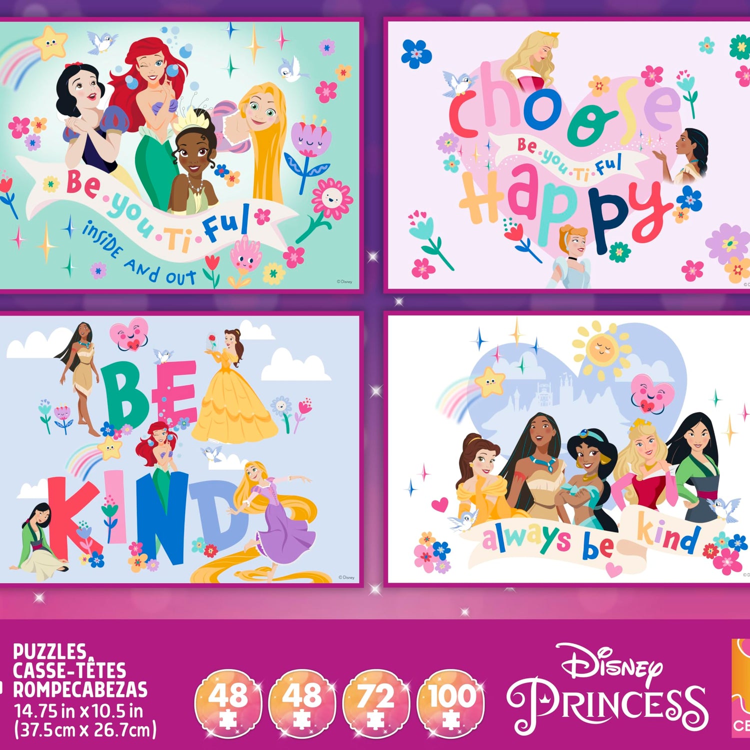 Details: This exciting 4 in 1 kid’s puzzle set from Buffalo games features some of Disney’s most popular Princess characters! Two 48-piece puzzles, one 72-piece and one 100-piece provide perfect steppingstones for little hands just learning to puzzle. The bright, colorful pictures depict Disney’s Snow White, Ariel, Tiana, Rapunzel, Pocahontas, Mulan, Belle, Jasmine, Aurora and Cinderella with important slogans reminding young puzzlers to be kind and be themselves! The pieces of this puzzle are larger than traditional puzzle pieces, which makes them easier to see and hold for a pleasant puzzle experience. Every Buffalo Games jigsaw puzzle is manufactured from recycled puzzle board. A precision cutting technique guarantees that every piece will fit soundly with the company's signature Perfect Snap™. A bonus puzzle poster is also included so that you have a handy reference of what the completed puzzle should look like while you put yours together.