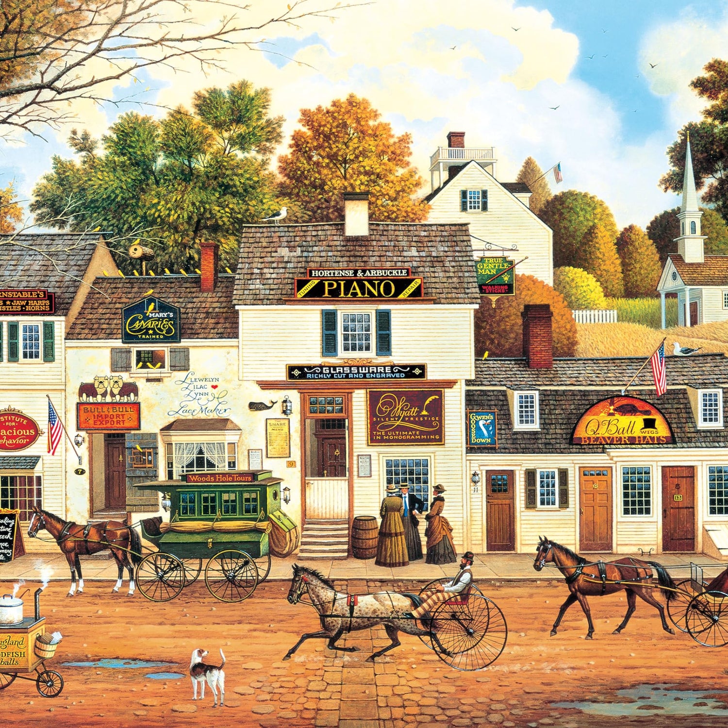 Details: This 1000-piece jigsaw puzzle, based on the artwork of famed folk artist Charles Wysocki, is titled Olde Cape Cod. Take a walk back in time to a busy New England street that offers something for everyone! Buy a hat, or a musical instrument, or even learn proper etiquette at the Institute For Gracious Behavior. For more than 40 years Charles Wysocki enjoyed his love affair with life and Americana, and through his imaginative and colorful artwork, touched the hearts of millions worldwide. "Chuck" felt a special kinship with puzzlers who share in the creative process by building his paintings one piece at a time. The Silver Select puzzles are curated and timeless images from The Walt Disney Company, Charles Wysocki, and more. They are packaged in a giftable box with silver foil accents, use premium recycled puzzle board, and include a full-color diagram. Every Buffalo Games jigsaw puzzle is manufactured from recycled puzzle board. A precision cutting technique guarantees that every piece will fit soundly with the company's signature Perfect Snap™. A bonus puzzle poster is also included so that you have a handy reference of what the completed puzzle should look like while you put yours together.