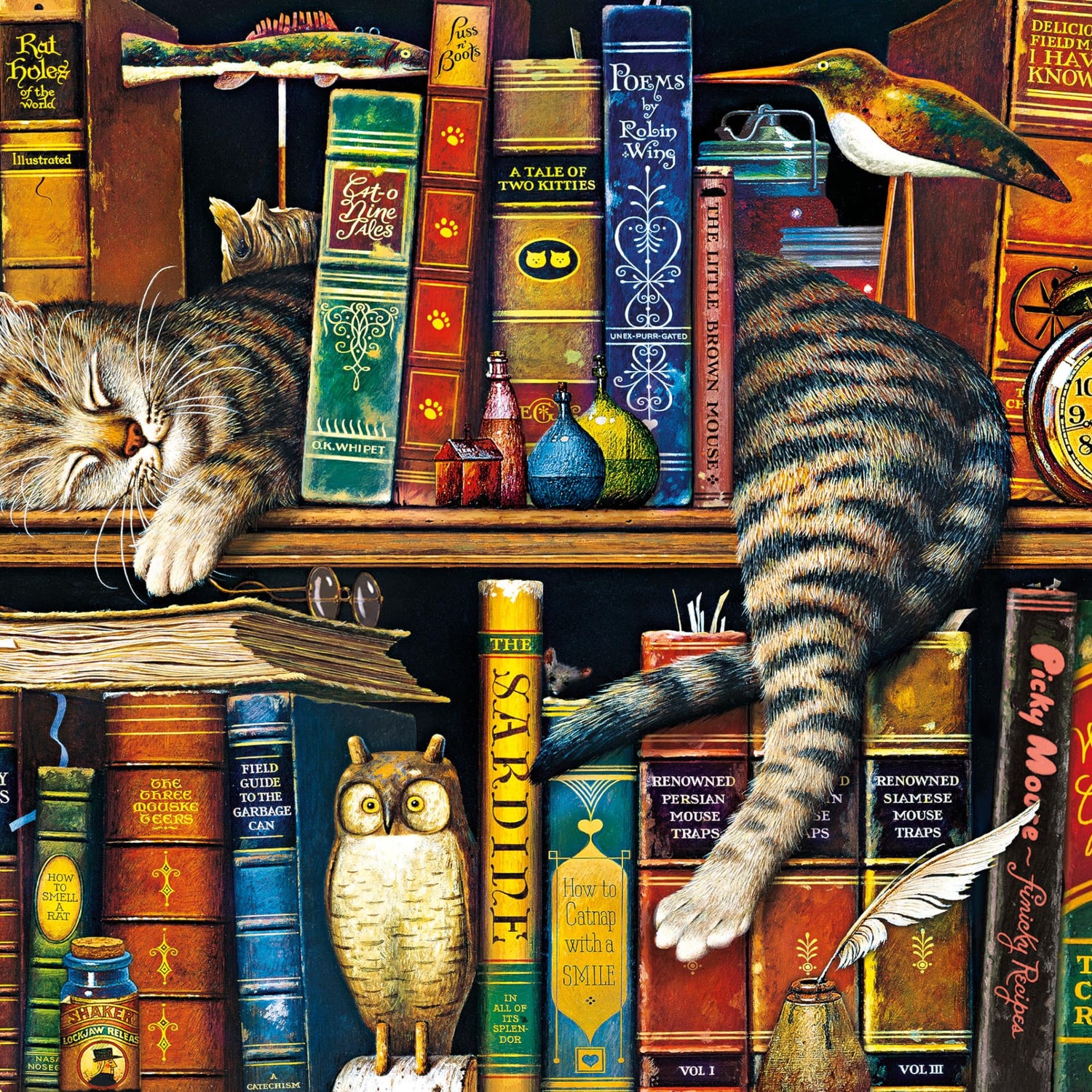 Details: This 1000-piece jigsaw puzzle, based on the artwork of famed folk artist Charles Wysocki, is titled Frederick the Literate. A curious little cat is nestled within his favorite books. Frederick has already finished some of his favorite classics. What book will he be reading next- A Tale of Two Kitties, or The Three Mousketeers? Explore some of Frederick’s other favorite books in this whimsical Charles Wysocki puzzle. For more than 40 years Charles Wysocki enjoyed his love affair with life and Americana, and through his imaginative and colorful artwork, touched the hearts of millions worldwide. "Chuck" felt a special kinship with puzzlers who share in the creative process by building his paintings one piece at a time. The Silver Select puzzles are curated and timeless images from The Walt Disney Company, Charles Wysocki, and more. They are packaged in a giftable box with silver foil accents, use premium recycled puzzle board, and include a full-color diagram. Every Buffalo Games jigsaw puzzle is manufactured from recycled puzzle board. A precision cutting technique guarantees that every piece will fit soundly with the company's signature Perfect Snap™. A bonus puzzle poster is also included so that you have a handy reference of what the completed puzzle should look like while you put yours together.