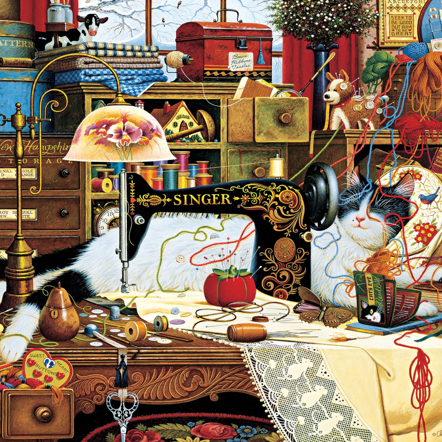 Details: The folksy charm of Charles Wysocki's artwork shines through in this 1000-piece jigsaw puzzle, Maggie The Messmaker. Cat lovers and non-cat lovers alike will enjoy putting together this incredibly detailed puzzle that showcases cats doing what they do best - hanging out. For more than 40 years Charles Wysocki enjoyed his love affair with life and Americana, and through his imaginative and colorful artwork, touched the hearts of millions worldwide. "Chuck" felt a special kinship with puzzlers who share in the creative process by building his paintings one piece at a time. The Silver Select puzzles are curated and timeless images from The Walt Disney Company, Charles Wysocki, and more. They are packaged in a giftable box with silver foil accents, use premium recycled puzzle board, and include a full-color diagram. Every Buffalo Games jigsaw puzzle is manufactured from recycled puzzle board. A precision cutting technique guarantees that every piece will fit soundly with the company's signature Perfect Snap™. A bonus puzzle poster is also included so that you have a handy reference of what the completed puzzle should look like while you put yours together.