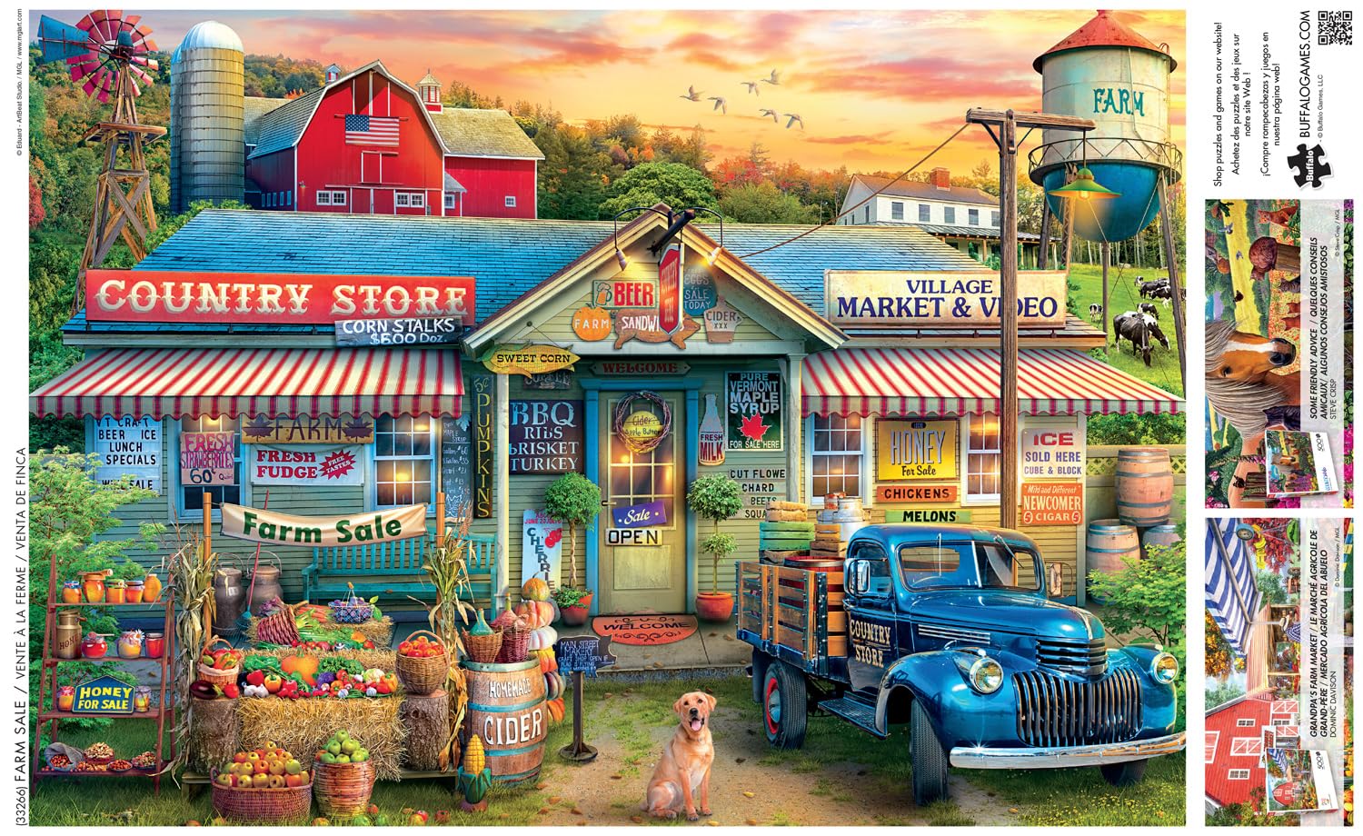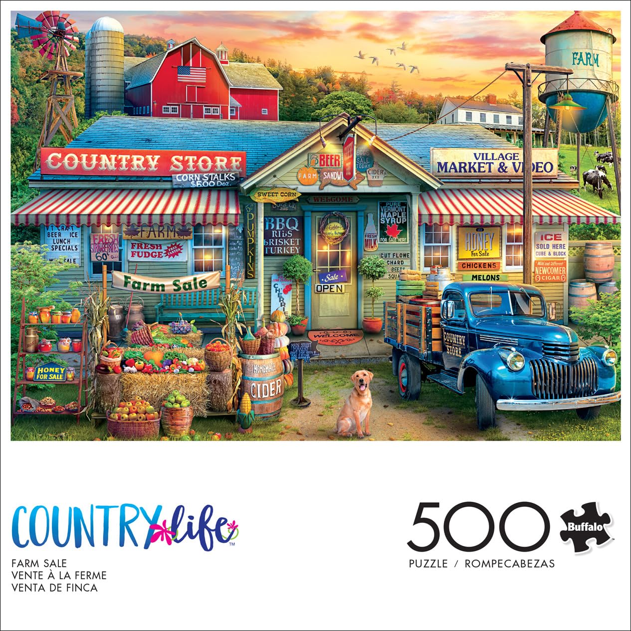 Details: This 500-piece jigsaw puzzle, Farm Sale, is part of the Country Life Collection by Buffalo Games. This puzzle features a charming country store overflowing with fresh produce, delectable fudge, and sweet honey. A picturesque barn in the distance and a Labrador pup out front add to the rustic charm and warmth of this inviting setting. Every Buffalo Games jigsaw puzzle is manufactured from recycled puzzle board. A precision cutting technique guarantees that every piece will fit soundly with the company's signature Perfect Snap™. A bonus puzzle poster is also included so that you have a handy reference of what the completed puzzle should look like while you put yours together.