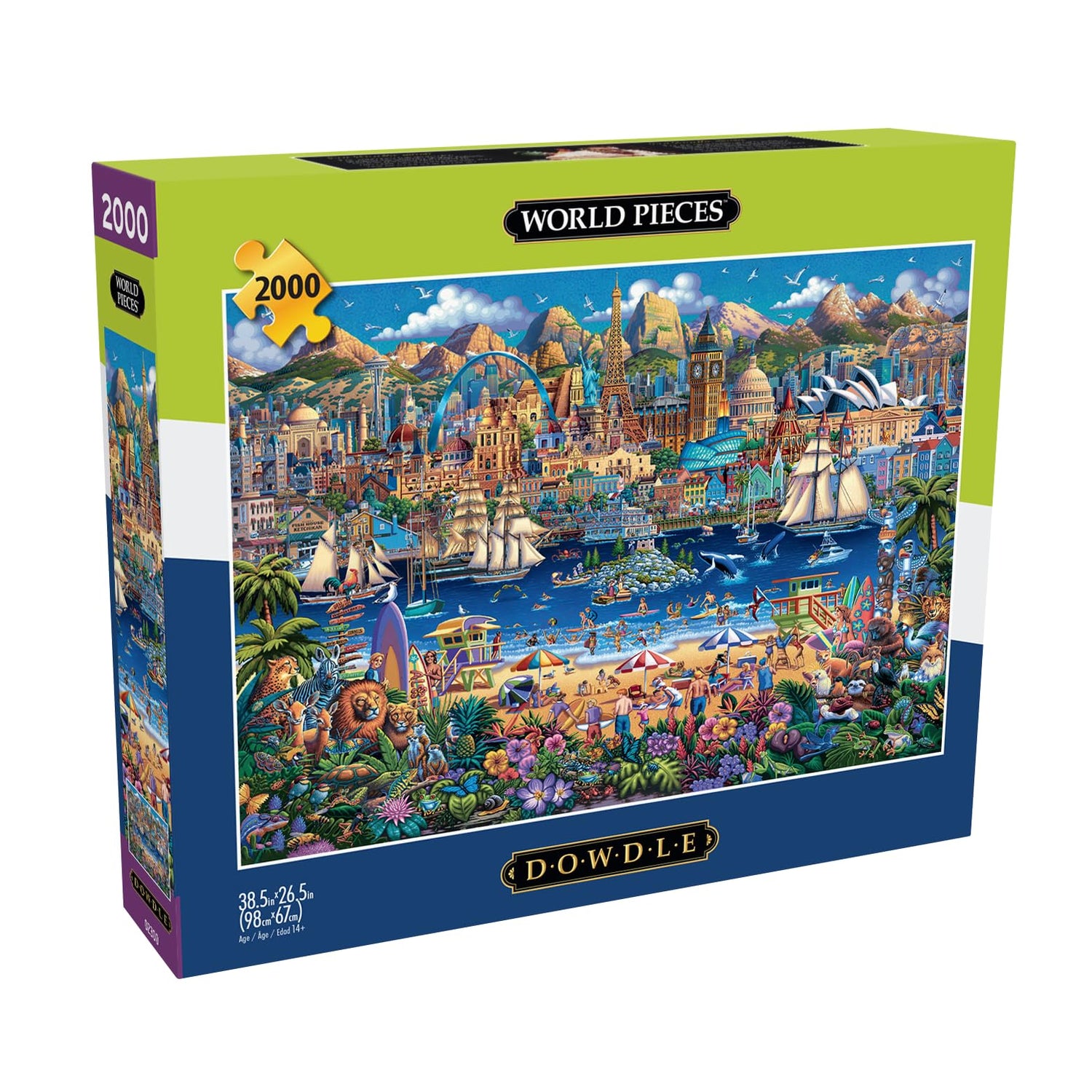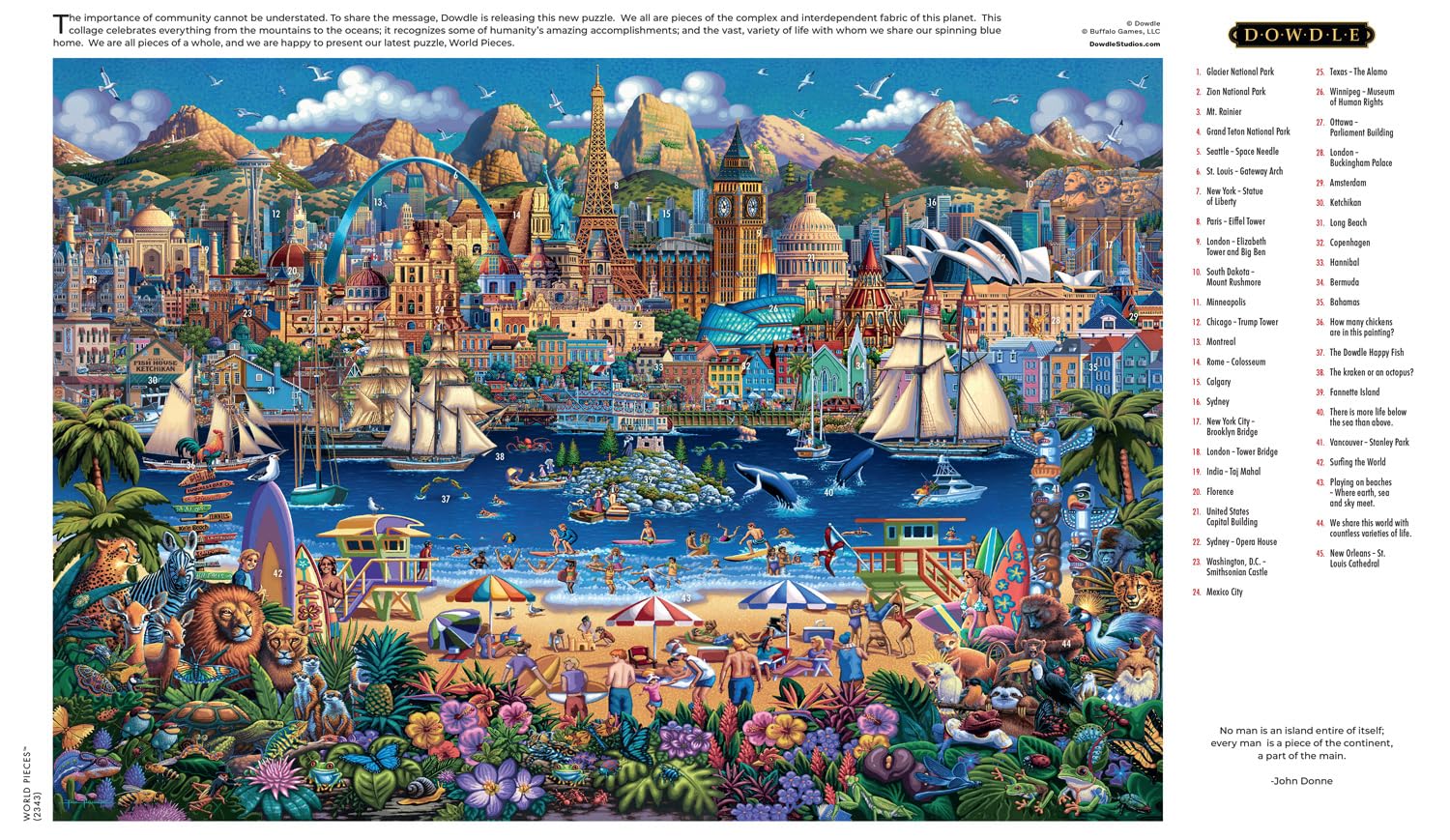 Details: This 2000-piece jigsaw puzzle titled “World Pieces” is based on the artwork of Eric Dowdle. Through this image, Dowdle wanted to share the importance of community. This collage celebrates everything from the mountains to the oceans; it recognizes some of humanity’s amazing accomplishments; and the vast, variety of life with whom we share our spinning blue home. Eric Dowdle was born the tenth of 12 children to a family of storytellers. He has traveled the world to discover fascinating people and places to include in his art. Each Dowdle puzzle has a colorful story to tell. Every Buffalo Games jigsaw puzzle is manufactured from recycled puzzle board. A precision cutting technique guarantees that every piece will fit soundly with the company's signature Perfect Snap™. A bonus puzzle poster is also included so that you have a handy reference of what the completed puzzle should look like while you put yours together.