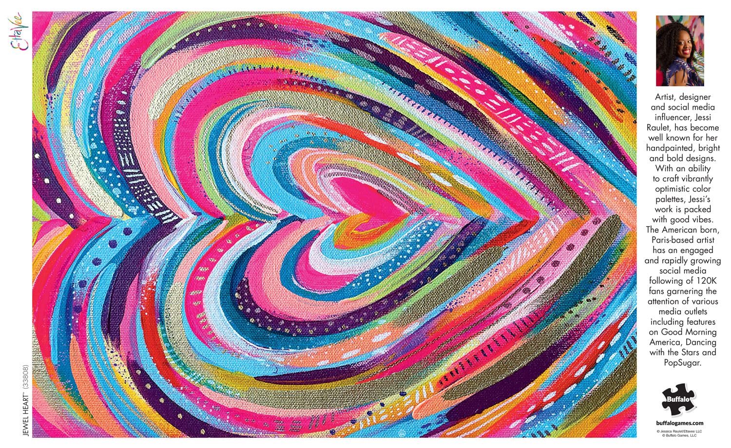 Details: This 500-piece jigsaw puzzle, Bright Heart, is from the Diverse Artists Series by Buffalo Games, and from artist Ettavee. This puzzle features a beautifully painted heart bursting with vivid colors and patterns. Piece by piece, you'll be enchanted by the expressive brushstrokes and bold composition, creating a delightful challenge that celebrates the power of love and self-expression. Every Buffalo Games jigsaw puzzle is manufactured from recycled puzzle board. A precision cutting technique guarantees that every piece will fit soundly with the company's signature Perfect Snap™. A bonus puzzle poster is also included so that you have a handy reference of what the completed puzzle should look like while you put yours together.