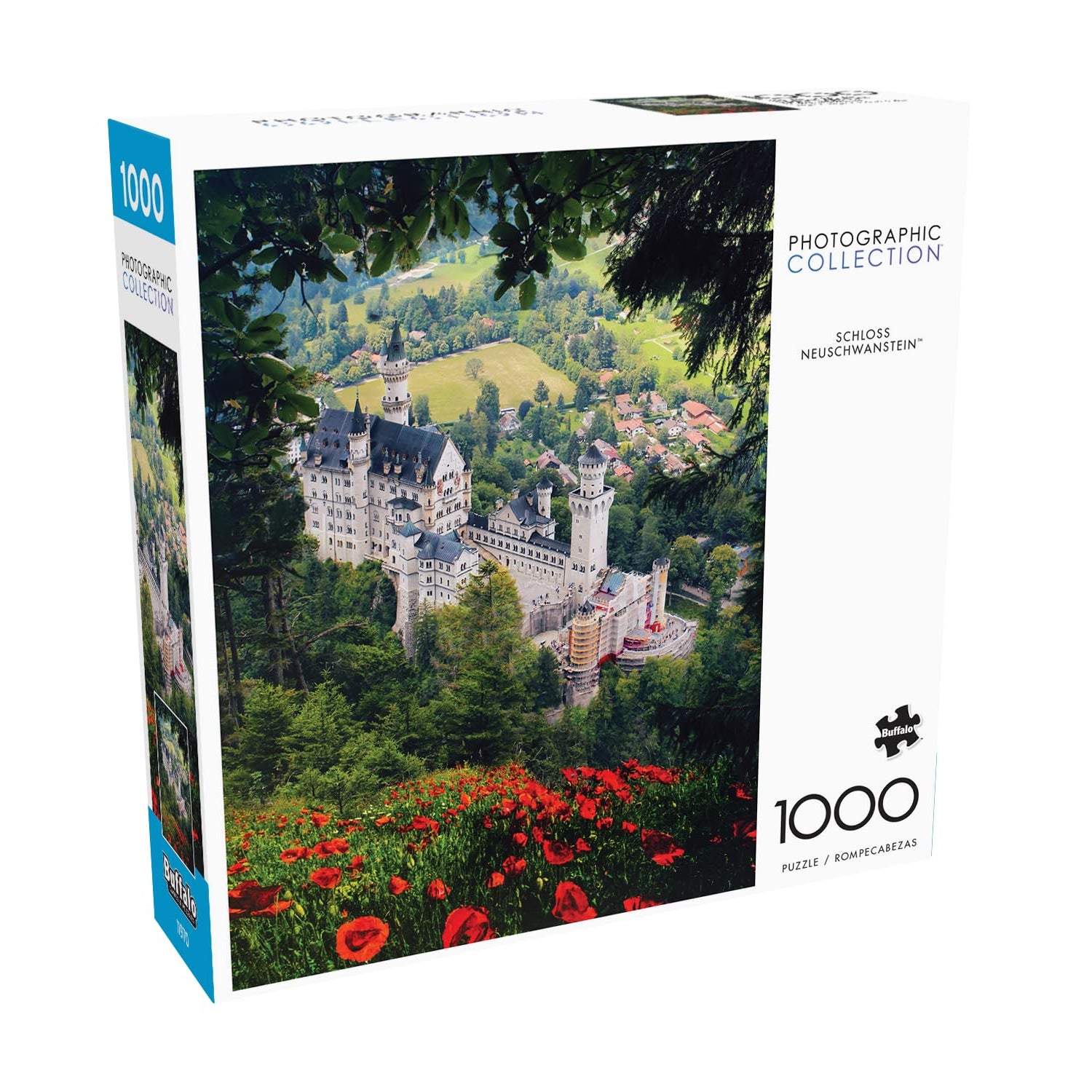 Details: This Buffalo Games 1000-piece puzzle is a photo of Schloss Neuschwanstein. Neuschwanstein Castle is a 19th-century historicist palace near Füssen in southwest Bavaria, Germany. The castle is surrounded by lush greens, and the photo is taken from a high perspective where red flowers can be seen in full bloom. Every Buffalo Games jigsaw puzzle is manufactured from recycled puzzle board. A precision cutting technique guarantees that every piece will fit soundly with the company's signature Perfect Snap. A bonus puzzle poster is also included so that you have a handy reference of what the completed puzzle should look like while you put yours together.