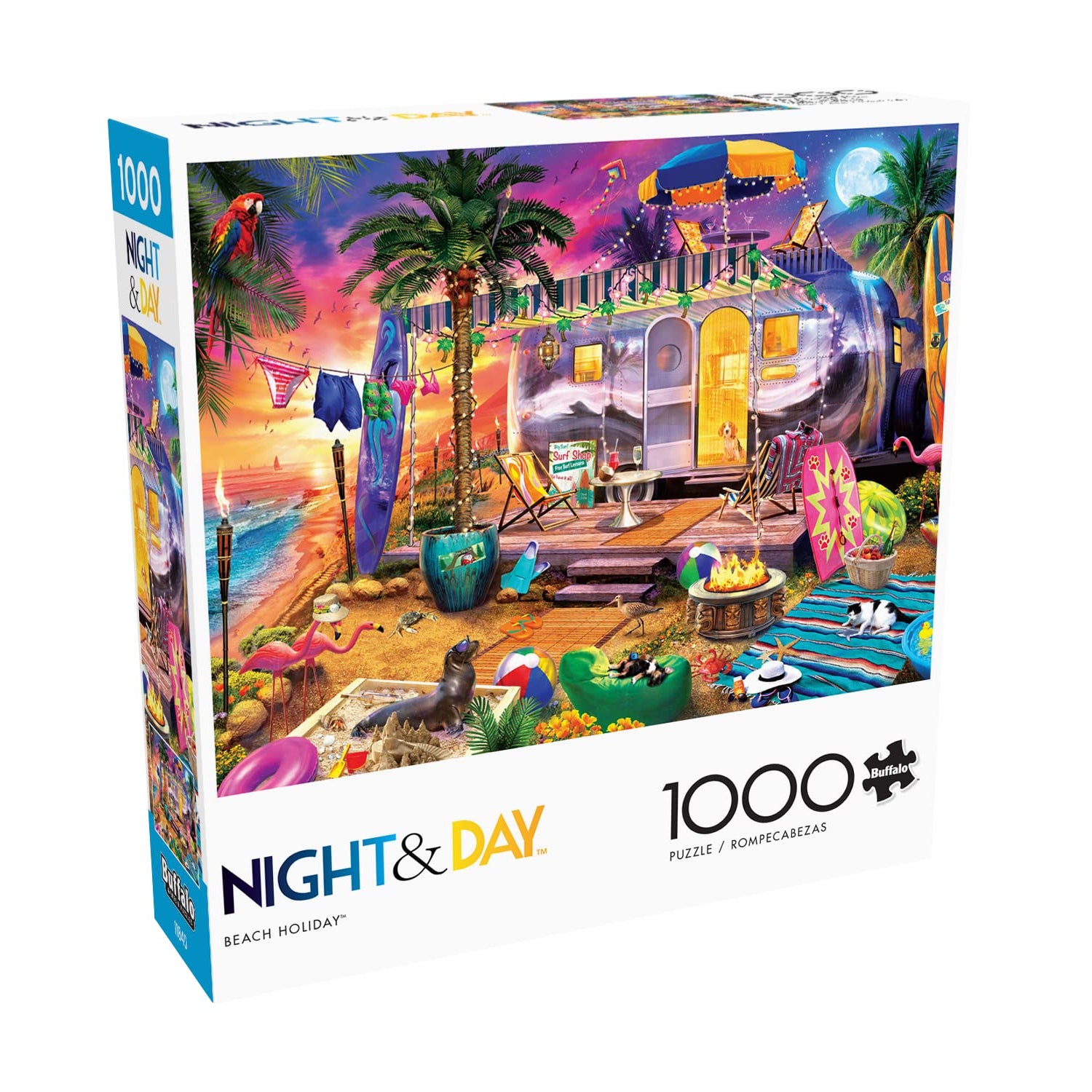 Details: Enjoy a beautiful vacation on the beach in this 1000-piece jigsaw puzzle that is part of the Night and Day collection by Buffalo Games. This puzzle titled “Beach Holiday” whisks you away to a coastal paradise where an old school Airstream sits on the beach, surrounded by palm trees, a campfire and many more small touches that make this beach feel like a home. The sky is filled with hues of purple and orange and even the local parrot sits perched on the branches of the palm trees. It is a view, and an environment like no other. Sit back and relax while you gaze at the full moon, lighting up the evening sky. Every Buffalo Games jigsaw puzzle is manufactured from recycled puzzle board. s signature Perfect Snap™. A bonus puzzle poster is also included so that you have a handy reference of what the completed puzzle should look like while you put yours together.