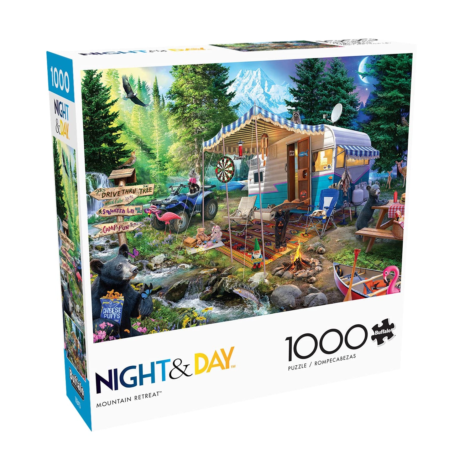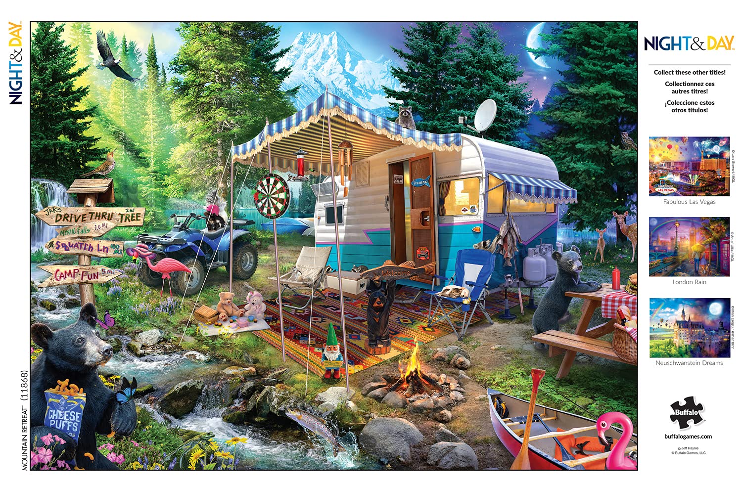 Details: This 1000-piece jigsaw puzzle, Mountain Retreat, is from the Night & Day Series by Buffalo Games. Have some fun while on vacation at this awesome outdoor getaway. Ride a four wheeler, play darts, or hike over to Squatch Lane during the daytime. At night, look out for animals that may come to visit your camp like bears or deer. The Night & Day Series captures the energetic ebb and flow from dawn 'til dark of different well-known landmarks around the world. Every Buffalo Games jigsaw puzzle is manufactured from recycled puzzle board. A precision cutting technique guarantees that every piece will fit soundly with the company's signature Perfect Snap™. A bonus puzzle poster is also included so that you have a handy reference of what the completed puzzle should look like while you put yours together.