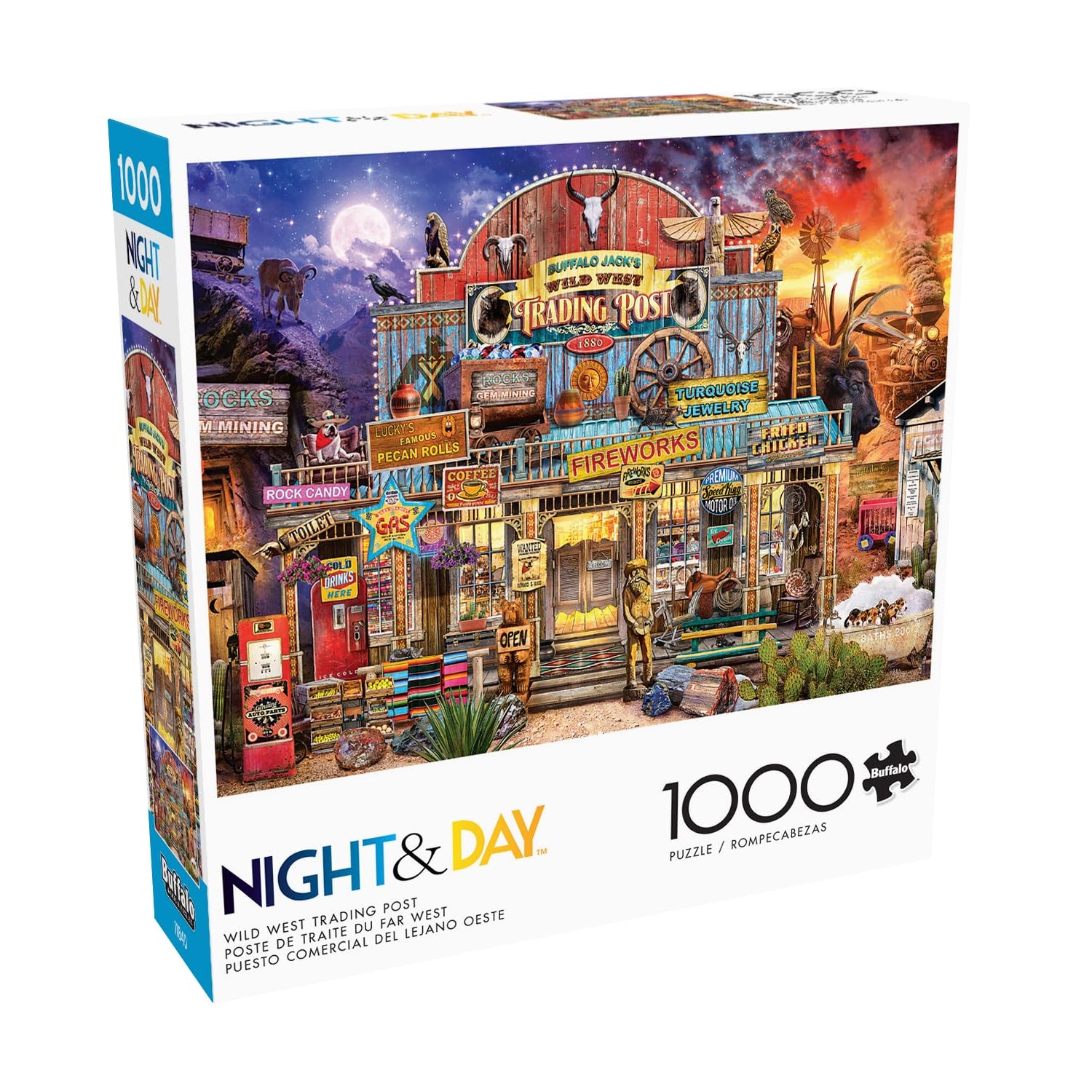 Details: This 1000-piece jigsaw puzzle, Wild West Trading Post, is from the Night & Day Series by Buffalo Games. Piece together the essence of a bustling trading post filled with fireworks, flavorful coffees, and mouthwatering fried chicken. The sky behind showcases the beauties of the desert from night to day, with towering mountains, desert cacti, playful wildlife, and a passing train. The Night & Day Series captures the energetic ebb and flow from dawn 'til dark of different well-known landmarks around the world. Every Buffalo Games jigsaw puzzle is manufactured from recycled puzzle board. A precision cutting technique guarantees that every piece will fit soundly with the company's signature Perfect Snap™. A bonus puzzle poster is also included so that you have a handy reference of what the completed puzzle should look like while you put yours together.
