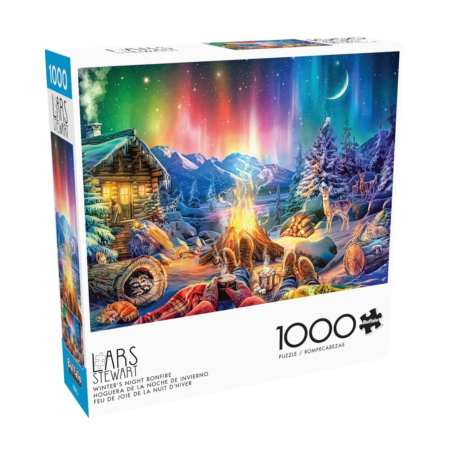 Details: This Buffalo Games 1000-piece jigsaw puzzle, Winter’s Night Bonfire, is based on the artwork of Lars Stewart. Feel the warmth of the campfire when you piece together this winter scene, featuring a cozy log cabin, a breathtaking aurora borealis, classic hot cocoa, and many cuddly critters- like deer, foxes, and a family of raccoons! Every Buffalo Games jigsaw puzzle is manufactured from recycled puzzle board. A precision cutting technique guarantees that every piece will fit soundly with the company's signature Perfect Snap™. A bonus puzzle poster is also included so that you have a handy reference of what the completed puzzle should look like while you put yours together.