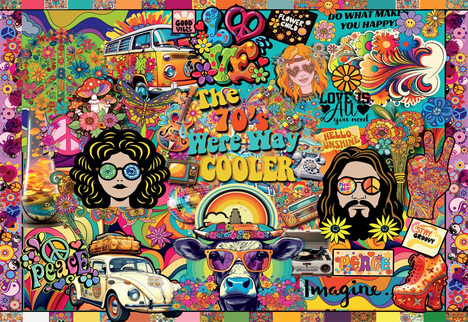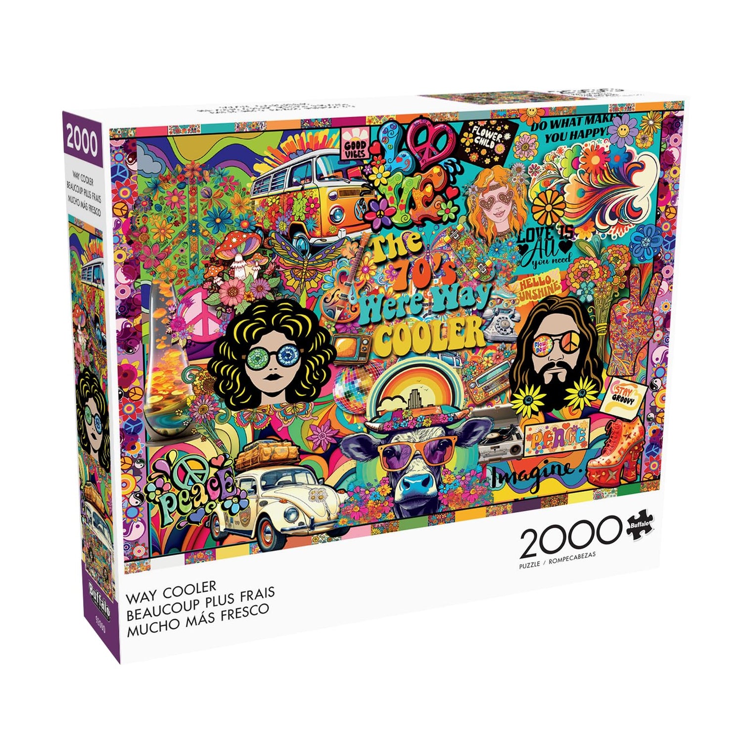 Details: This 2000-piece jigsaw puzzle by Buffalo Games is titled Way Cooler. Dive into a kaleidoscopic journey back to the groovy 70s with this psychedelic collage puzzle! Explore mesmerizing patterns, vibrant colors, and trippy visuals that capture the essence of an era defined by peace, love, and artistic exploration. Every Buffalo Games jigsaw puzzle is manufactured from recycled puzzle board. A precision cutting technique guarantees that every piece will fit soundly with the company's signature Perfect Snap™. A bonus puzzle poster is also included so that you have a handy reference of what the completed puzzle should look like while you put yours together.