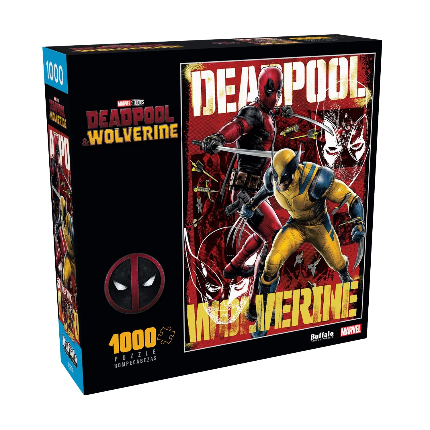 Details: This 1000-piece Marvel Studios jigsaw puzzle by Buffalo Games is titled “Best Bubs”. It features a dynamic image of Deadpool and Wolverine gearing up for battle, with their names and line drawings of their faces interposed on the artwork. Wolverine bares his claws menacingly while Deadpool draws his swords behind him. Every Buffalo Games jigsaw puzzle is manufactured from recycled puzzle board. A precision cutting technique guarantees that every piece will fit soundly with the company's signature Perfect Snap™. A bonus puzzle poster is also included so that you have a handy reference of what the completed puzzle should look like while you put yours together. © 2024 MARVEL