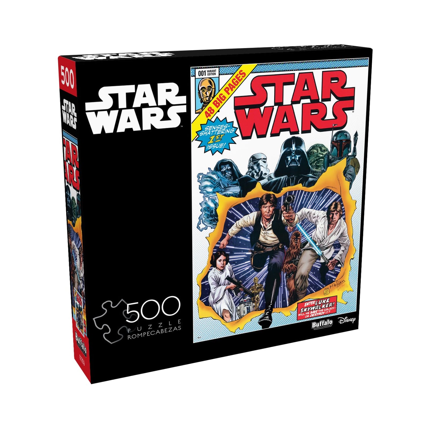 Details: This 1000-piece Star Wars jigsaw puzzle by Buffalo Games is titled “Senses Shattering”. It features comic book cover illustration of Han Solo, Luke Skywalker, Princess Leia and Chewbacca bursting out of the page, where Darth Vader, Boba Fett, Jabba the Hutt and Emperor Palpatine are posing menacingly. Every Buffalo Games jigsaw puzzle is manufactured from recycled puzzle board. A precision cutting technique guarantees that every piece will fit soundly with the company's signature Perfect Snap™. A bonus puzzle poster is also included so that you have a handy reference of what the completed puzzle should look like while you put yours together. @2024 LUCASFILM