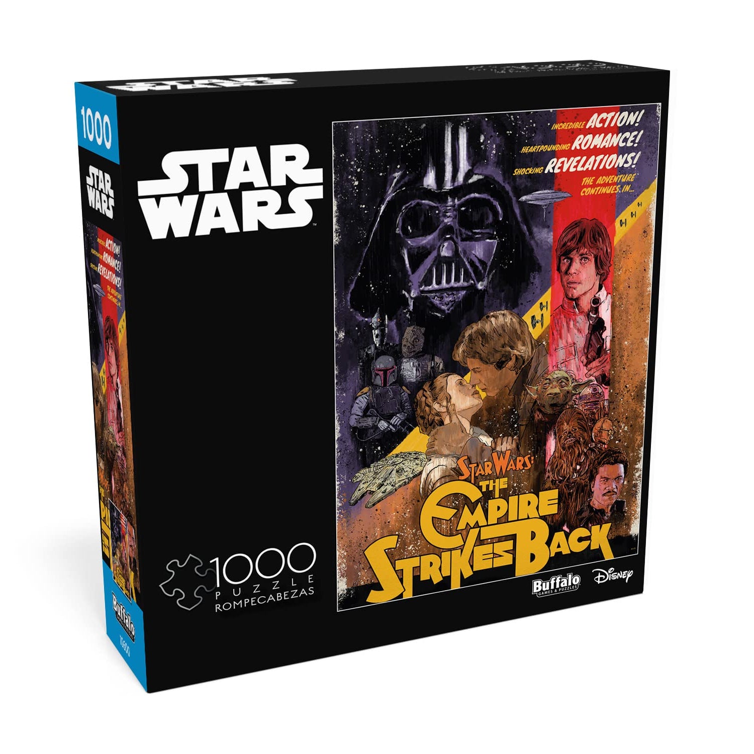 Details: Shocking Revelations is a 1000-piece puzzle from the Star Wars franchise. This puzzle features art from the fifth movie stylized as a movie poster. The image includes Darth Vader, some bounty hunters,Han Solo and Leia, Yoda, Chewbacca, C3P0, Lando, and Luke. Every Buffalo Games jigsaw puzzle is manufactured from recycled puzzle board. A precision cutting technique guarantees that every piece will fit soundly with the company's signature Perfect Snap. A bonus puzzle poster is also included so that you have a handy reference of what the completed puzzle should look like while you put yours together. & Lucasfilm Ltd. starwars.com