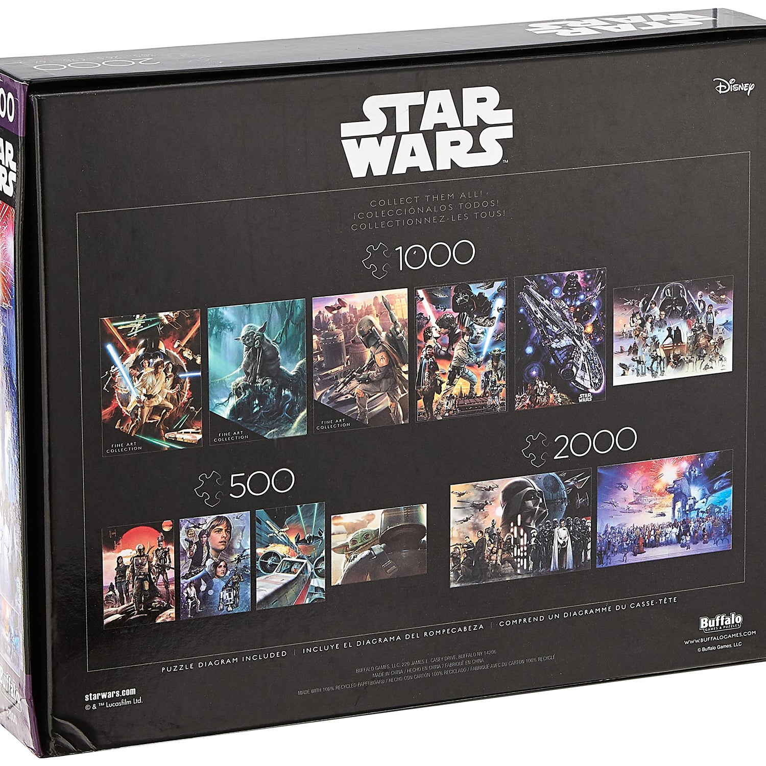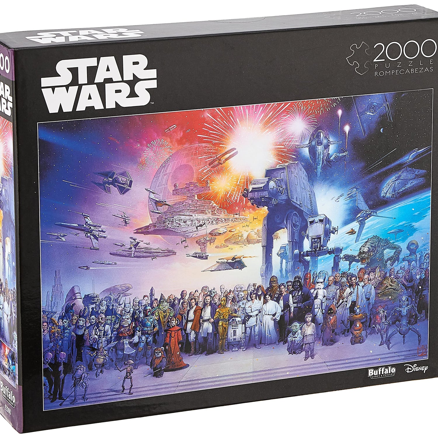 Details: "You Were the Chosen One" is a 2000-piece jigsaw puzzle featuring a huge collection of Star Wars™ characters and vehicles from episodes 1-6. Named after the famous quote from Star Wars: Episode III – Revenge of the Sith, this puzzle has all the most popular heroes and villains including Obi-Wan Kenobi, Darth Vader, Luke Skywalker, Han Solo, Princess Leia, R2-D2, C-3PO, Chewbacca, Yoda, Jabba the Hutt and more! Above the giant cast of characters, you can see the Death Star, an AT-AT, X-Wing, and even the Millennium Falcon. See if you can spot your favorite from the Star Wars™ universe! Every Buffalo Games jigsaw puzzle is manufactured using premium quality 100% recycled paperboard. s signature Perfect Snap™. A bonus puzzle poster is also included so that you have a handy reference of what the completed puzzle should look like while you put yours together.