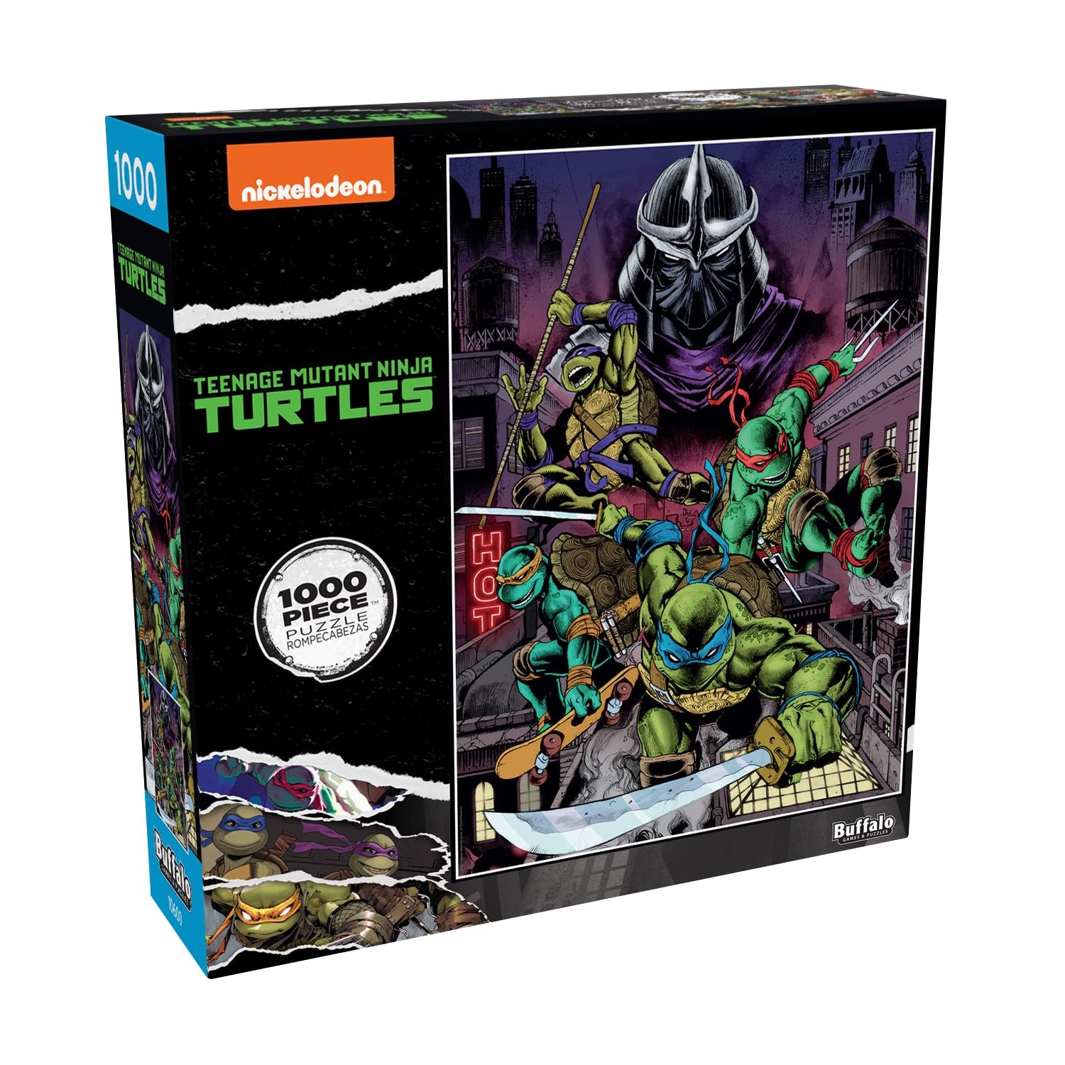 Details: This Buffalo Games 1000-piece Teenage Mutant Ninja Turtles jigsaw puzzle features comic-book style artwork of the half-shell heroes Leonardo, Michelangelo, Raphael and Donatello jumping through the city, as Shredder looms overhead. Every Buffalo Games jigsaw puzzle is manufactured from recycled puzzle board. A precision cutting technique guarantees that every piece will fit soundly with the company's signature Perfect Snap™. A bonus puzzle poster is also included so that you have a handy reference of what the completed puzzle should look like while you put yours together. ©2024 Viacom International Inc.
