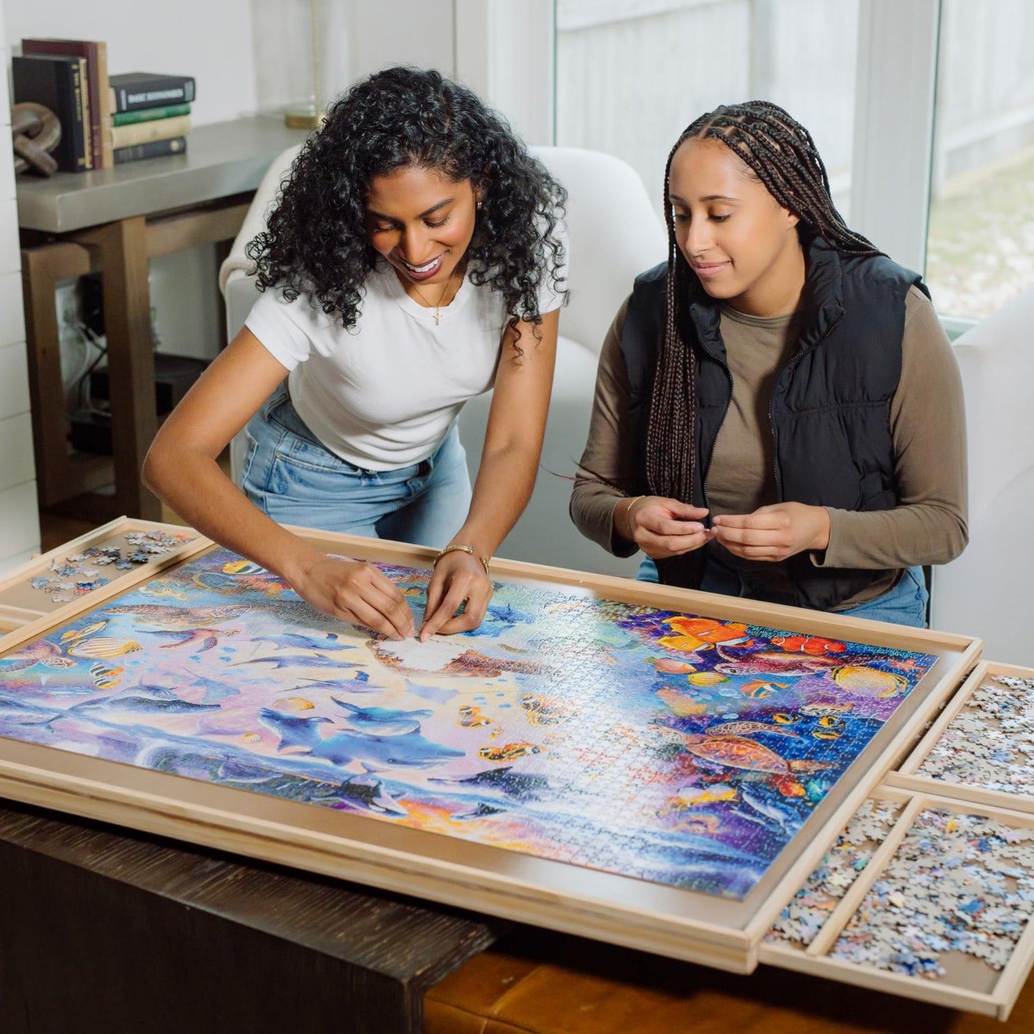 Buffalo Games - Wood Puzzle Table - Jumbo Size Fits Up to 2000pc Jigsaw Puzzles - Storage Drawers with Dividers for Pieces - Preassembled Except Drawer Handles