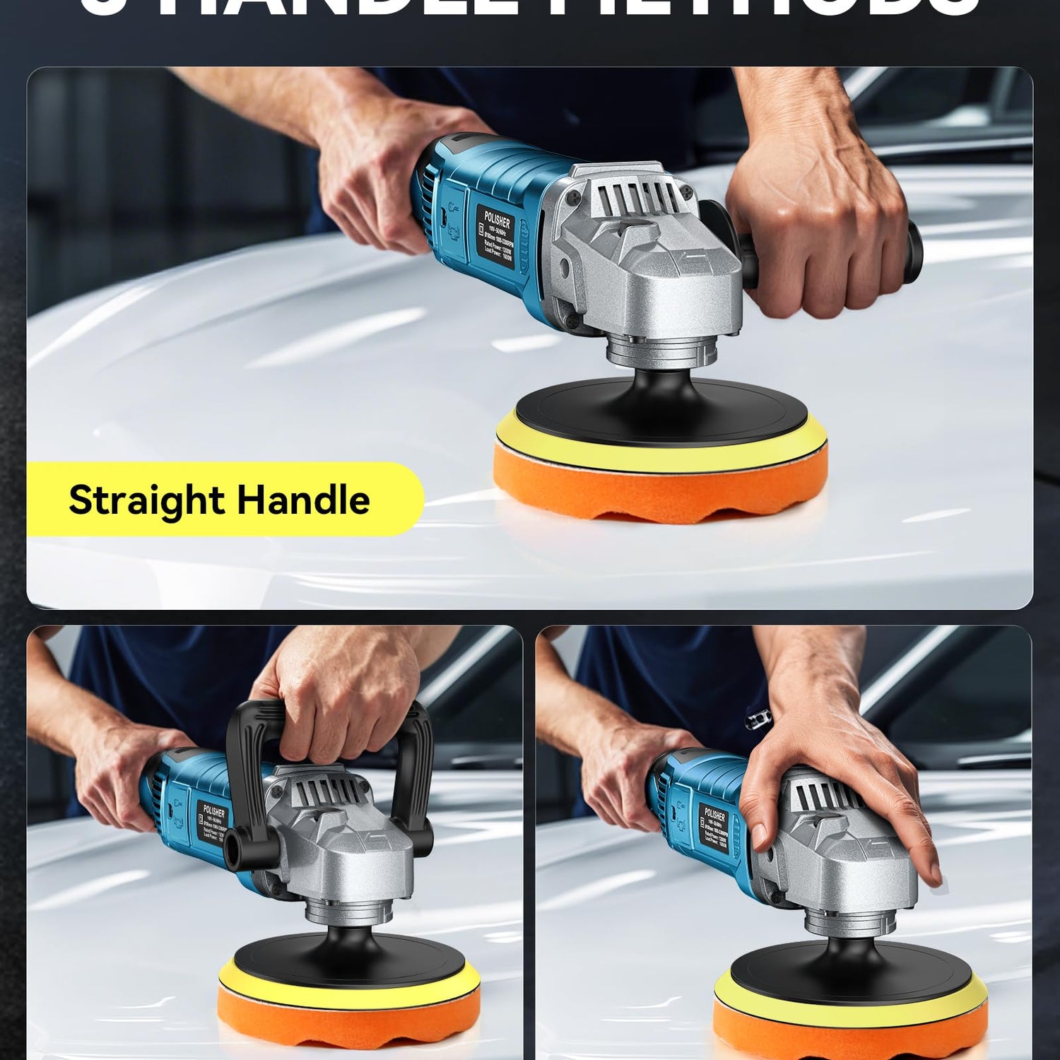 - 【THREE HANDLE DESIGNS】We understand the fatigue of using the car polisher for a long time,so our random orbital polisher buffer have specially designed 3 ergonomically designed handle styles to meet the different hand sizes and gripping habits of different users.Whether you are used to left-handed or right-handed operation,you can find the most suitable way to grip the rotary polisher,making the polishing process more relaxed,comfortable, efficient and safe