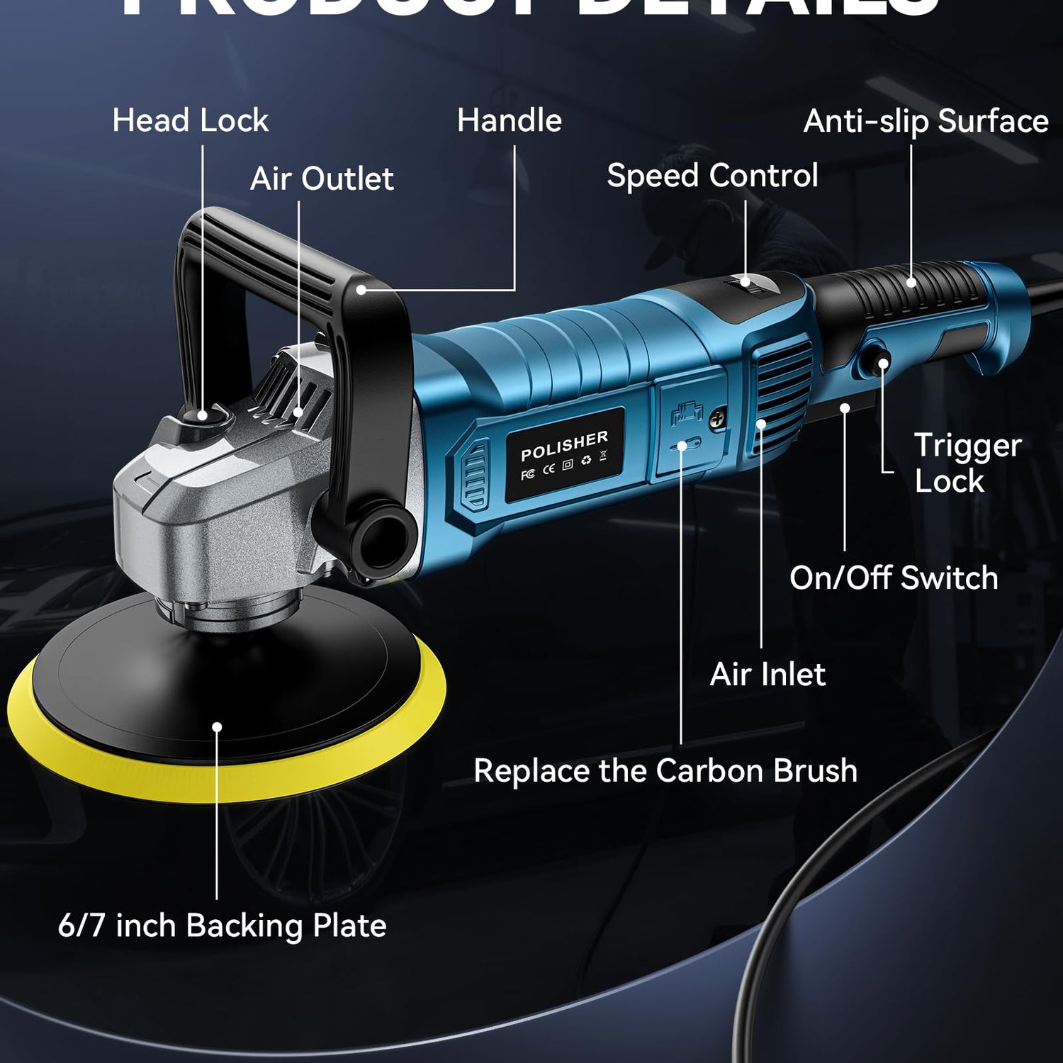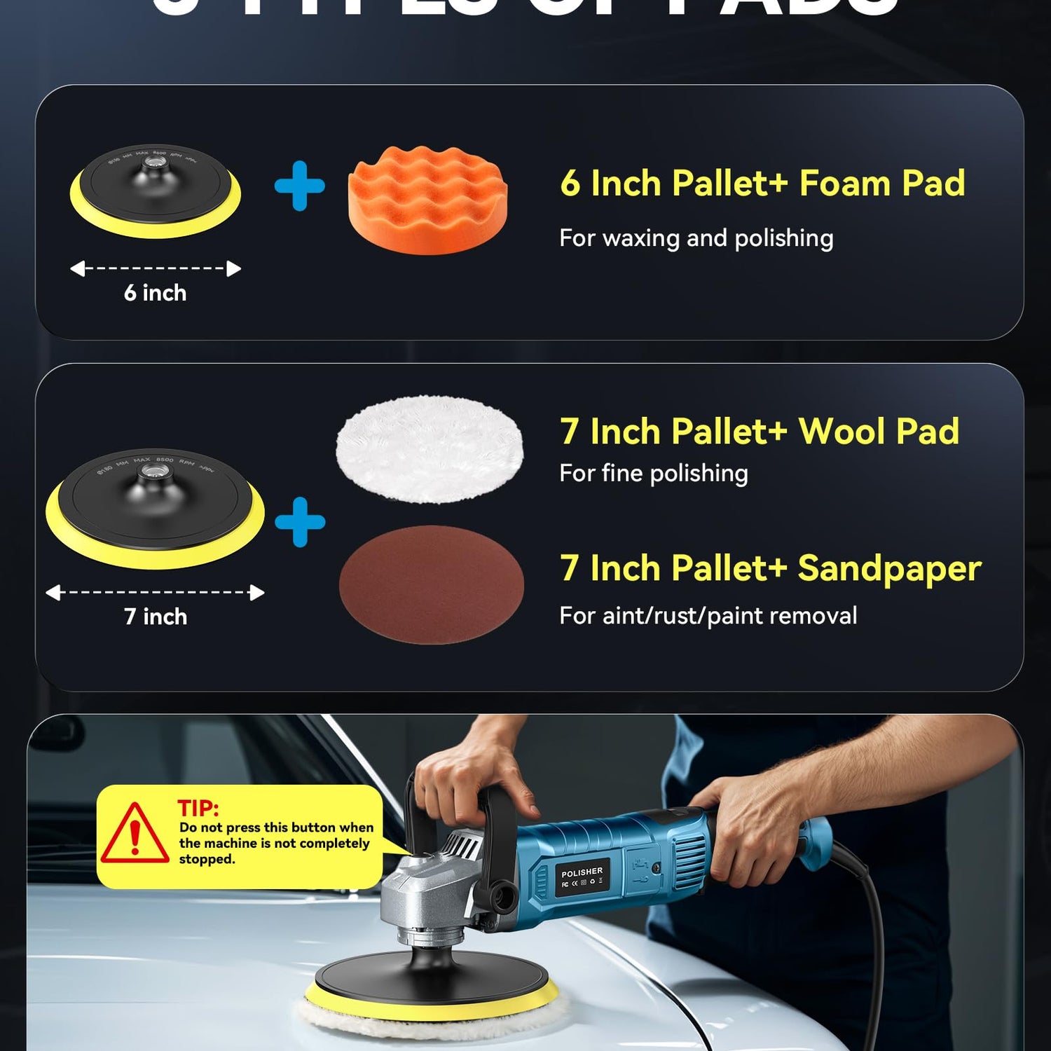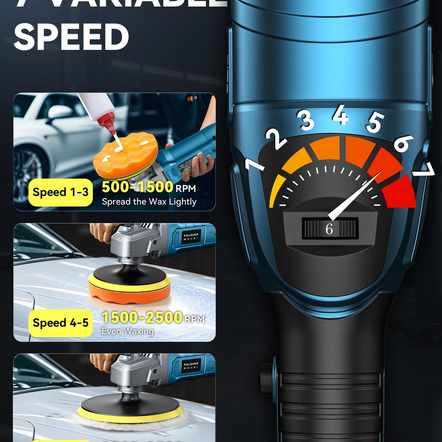 - 【7-SPEED VARIABLE】In order to meet the needs of different car paints and different degrees of polishing,the buffer polisher for car detailing have specially designed a 7-speed adjustment function,from delicate sanding to powerful polishing,you can freely choose the most suitable polishing speed according to the actual needs,whether it's delicate polishing or powerful decontamination,the polishing machine can be easily realized,so that every polishing is more accurate and efficient