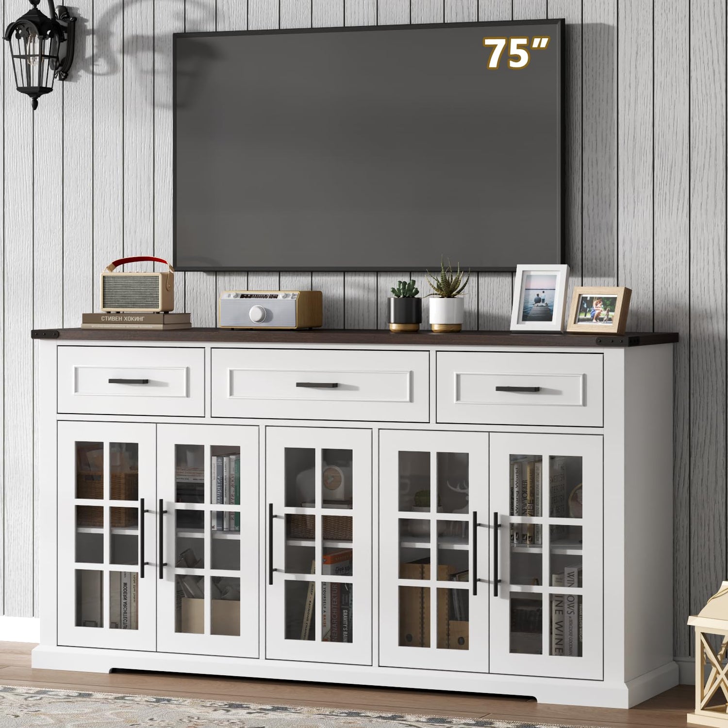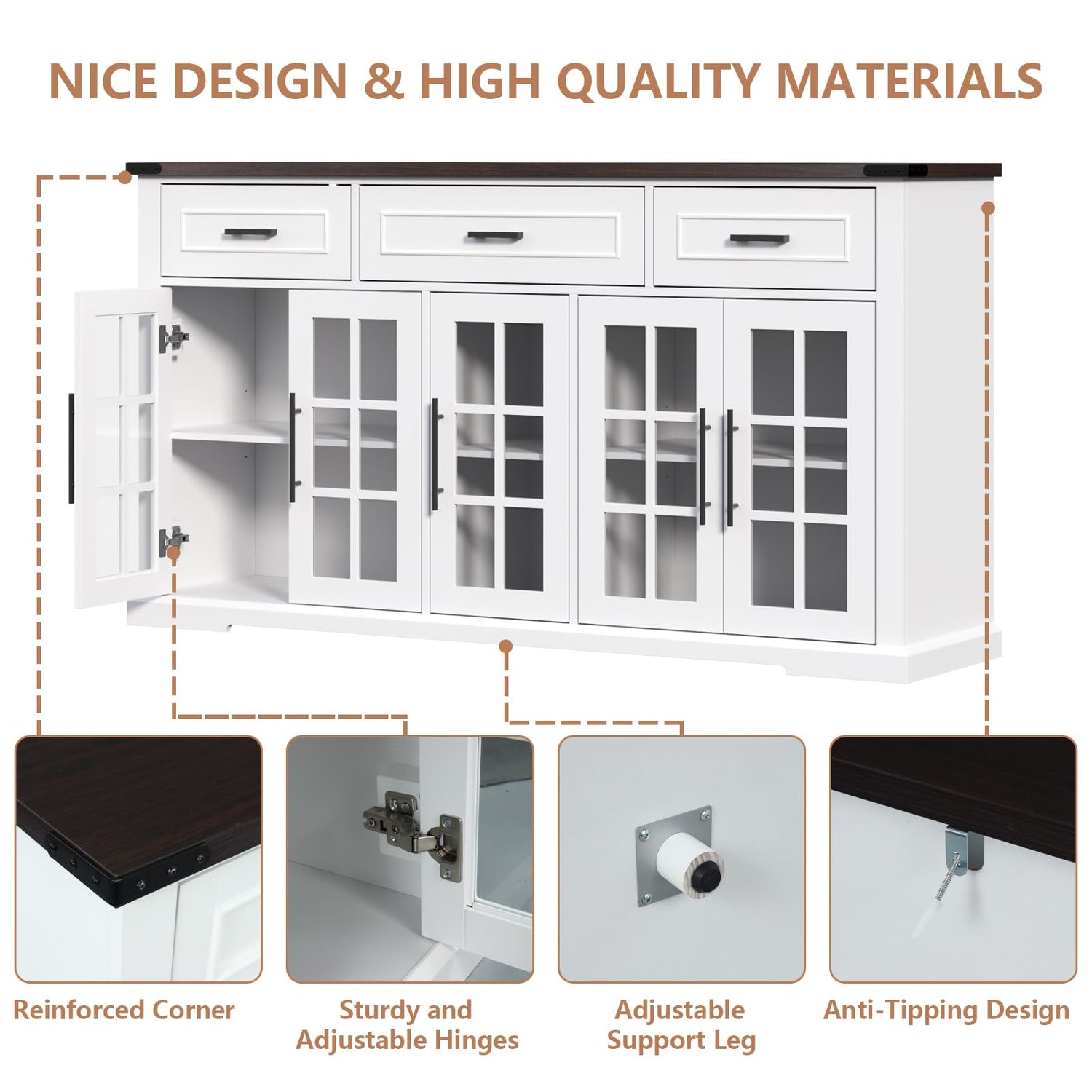 Buffet Cabinet with Storage, 63" Large Sideboard Cabinet with 3 Drawers & 5 Glass Doors, Modern Farmhouse Kitchen Cabinets Buffet Table with Adjustable Shelf, Coffee Bar Cabinets for Living Room